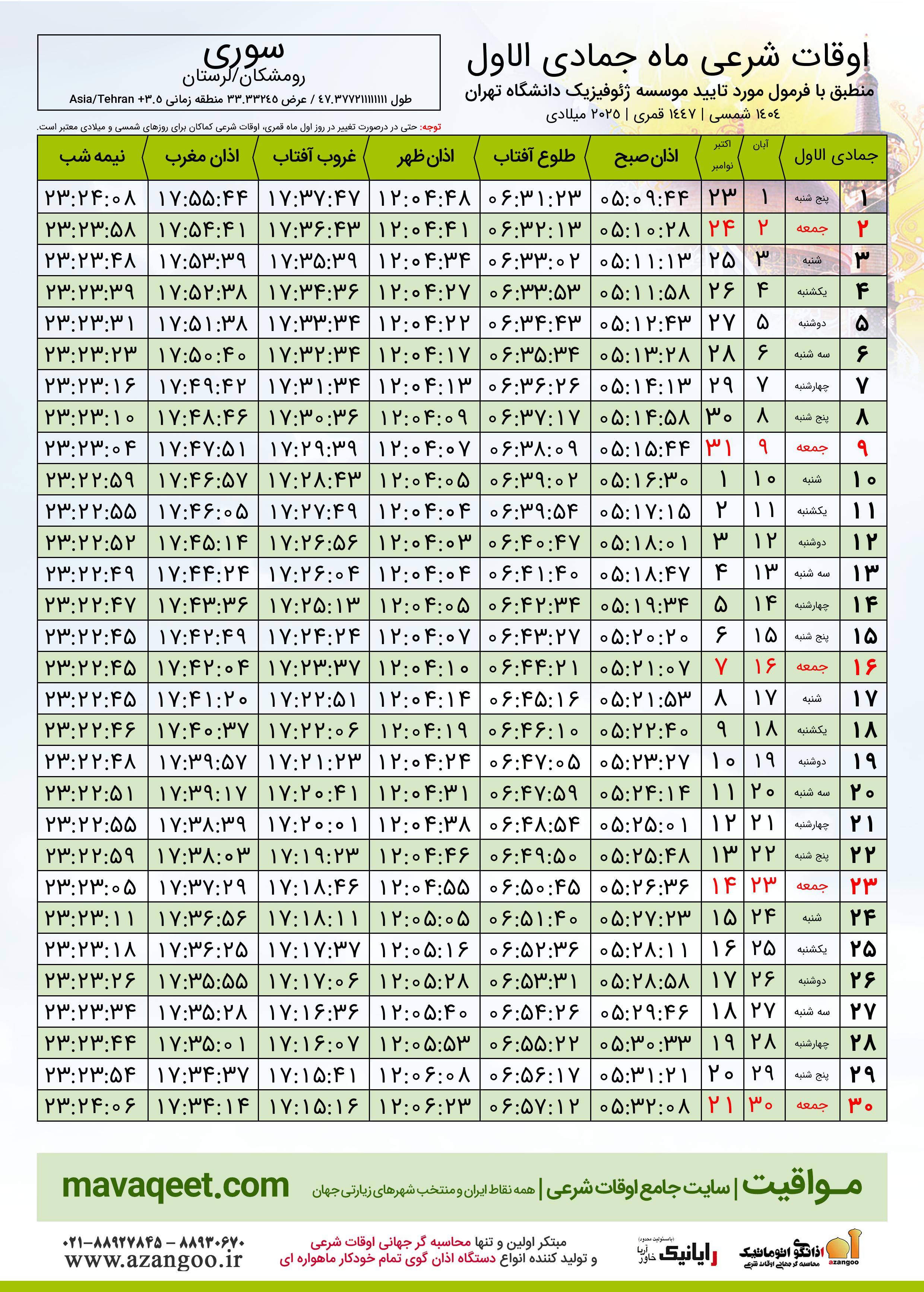 اوقات شرعی ماه جمادی الاول ١٤٤٧ هـ.ق شهر سوری بر