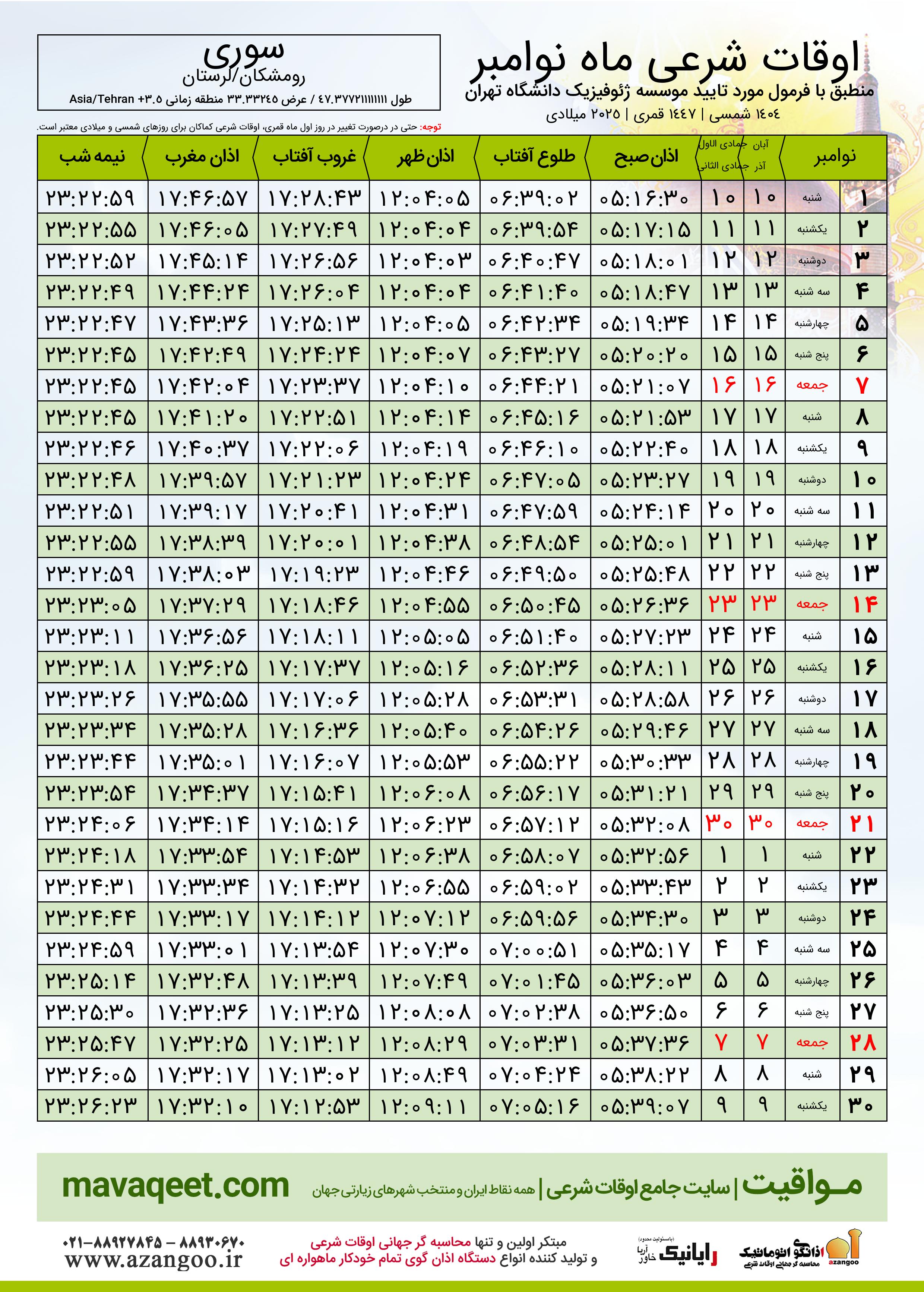 جدول اوقات شرعی نوامبر ٢٠٢٥ میلادی شهر سوری
