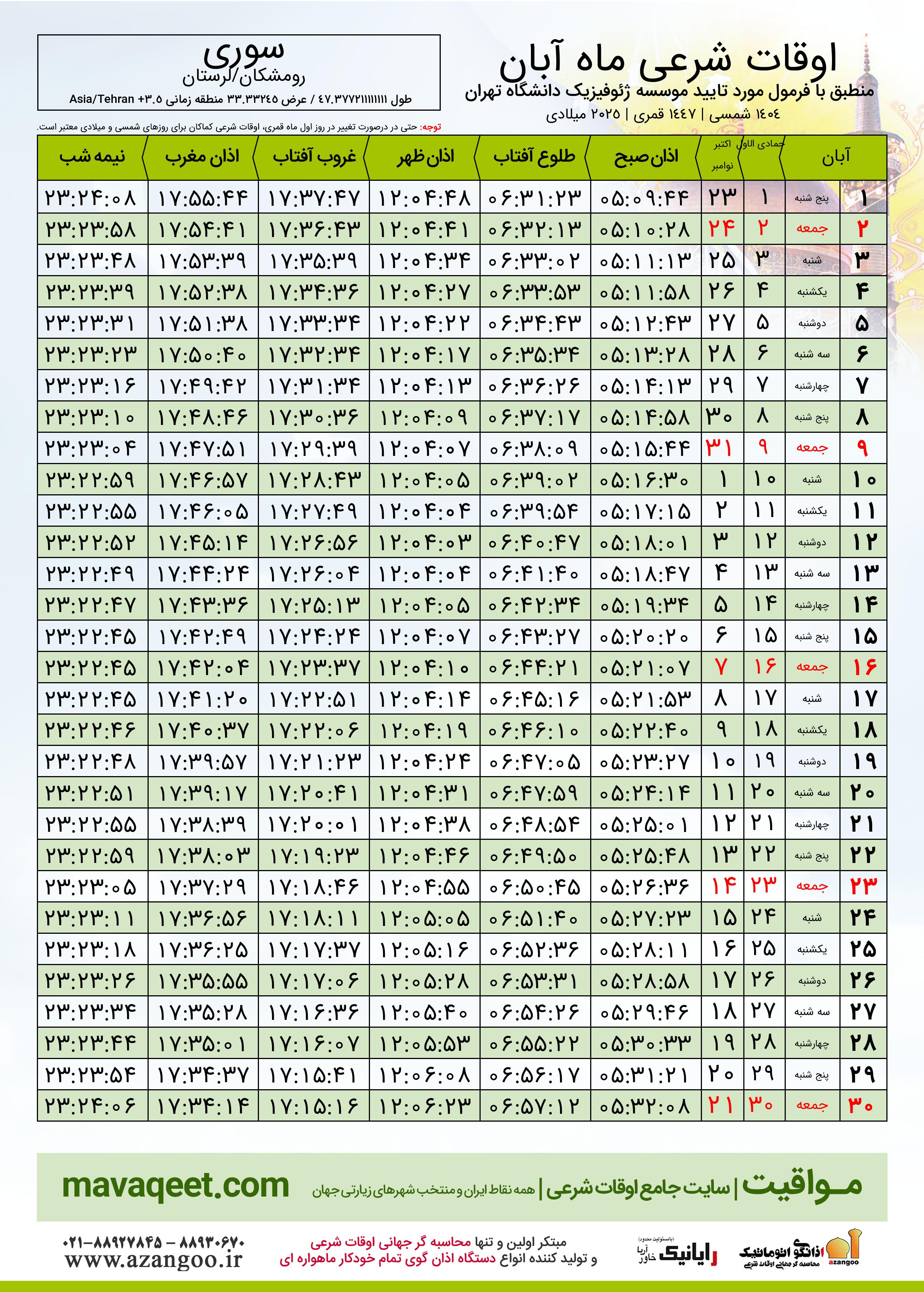 اوقات شرعی آبان ١٤٠٤ شمسی شهر سوری