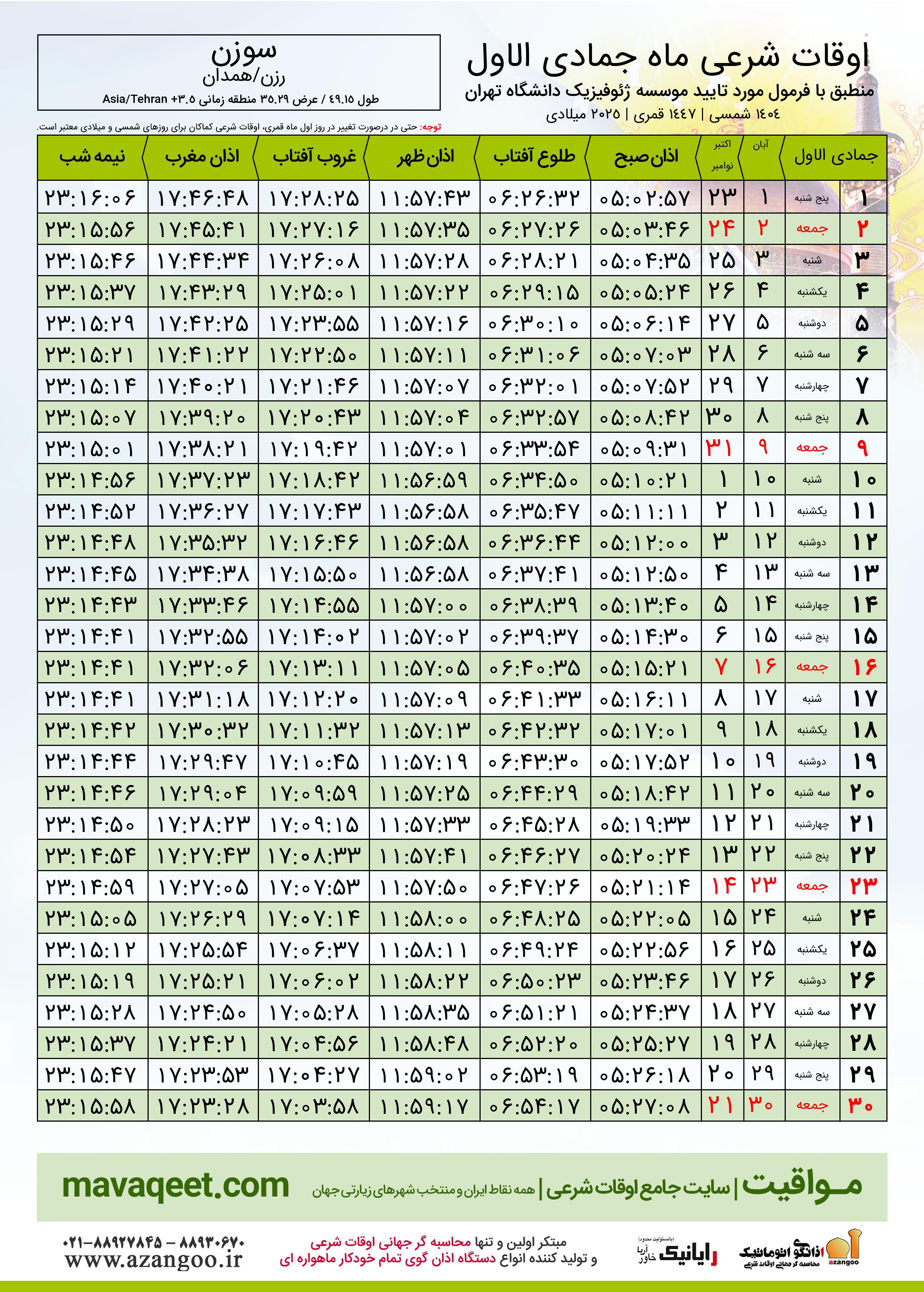 جدول اوقات شرعی جمادی الاول ١٤٤٧ قمری شهر سوزن