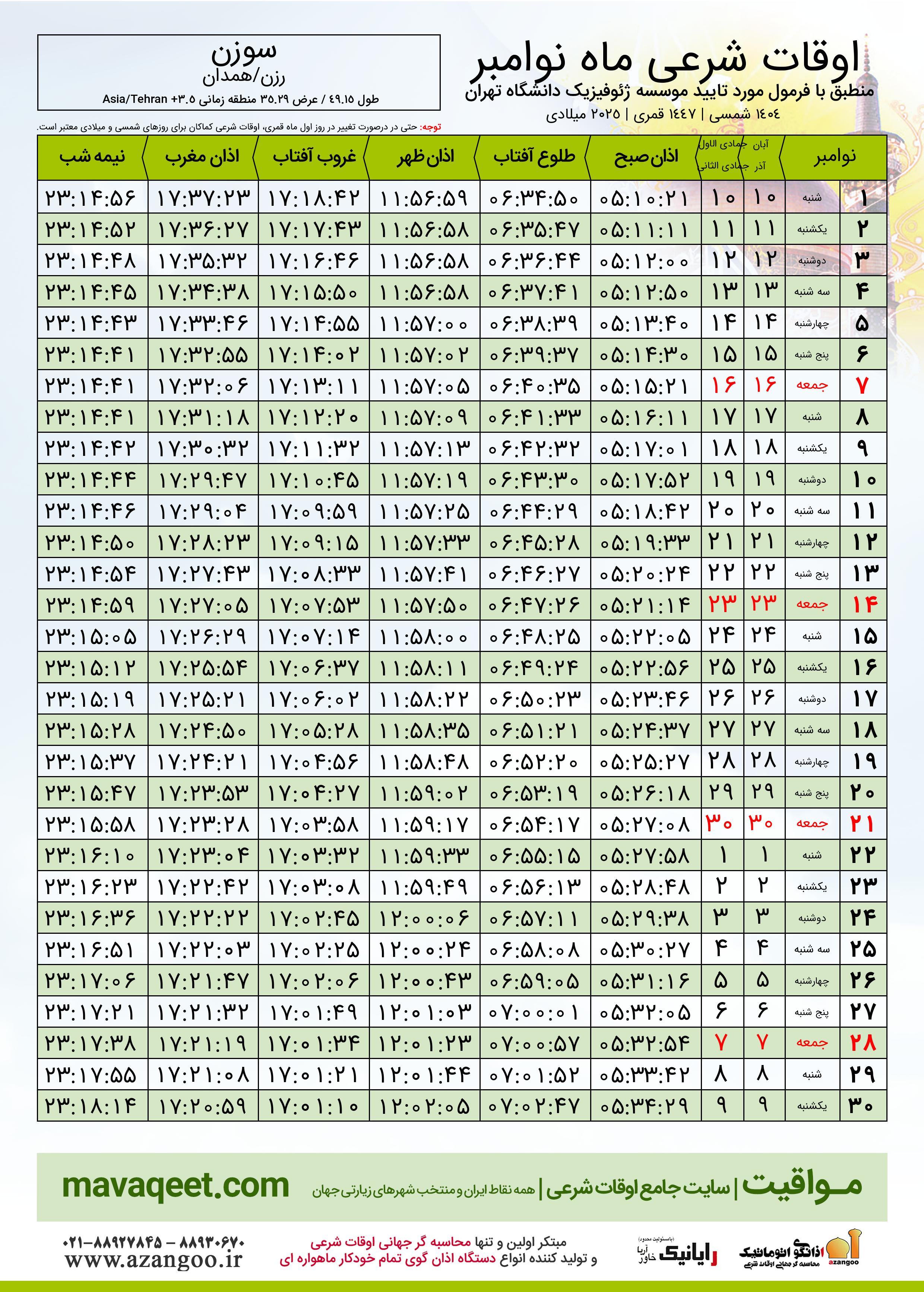 جدول اوقات شرعی نوامبر ٢٠٢٥ میلادی شهر سوزن