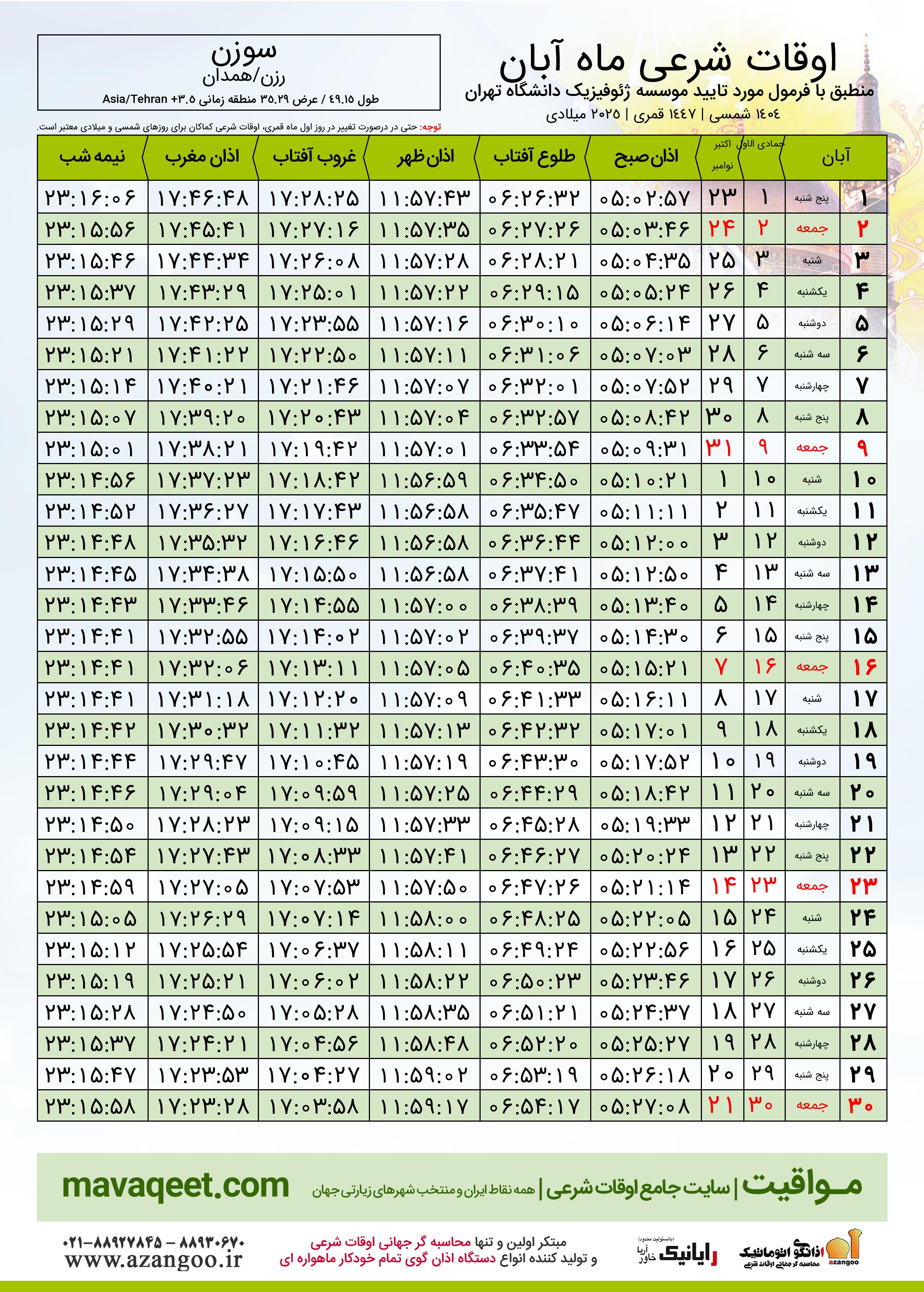 اوقات شرعی آبان ١٤٠٤ شمسی شهر سوزن