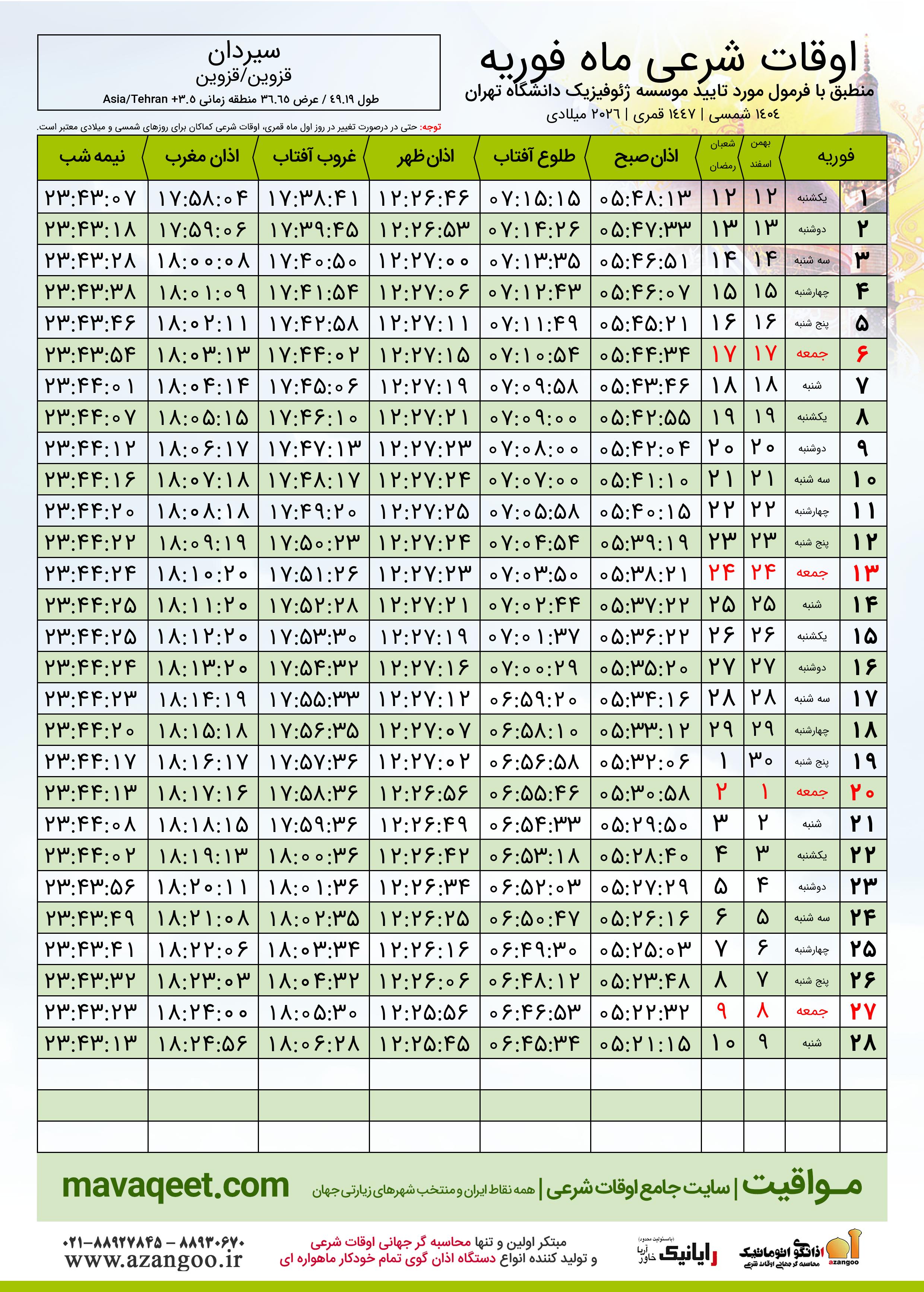 دانلود اوقات شرعی فوریه ٢٠٢٦ شهر سیردان