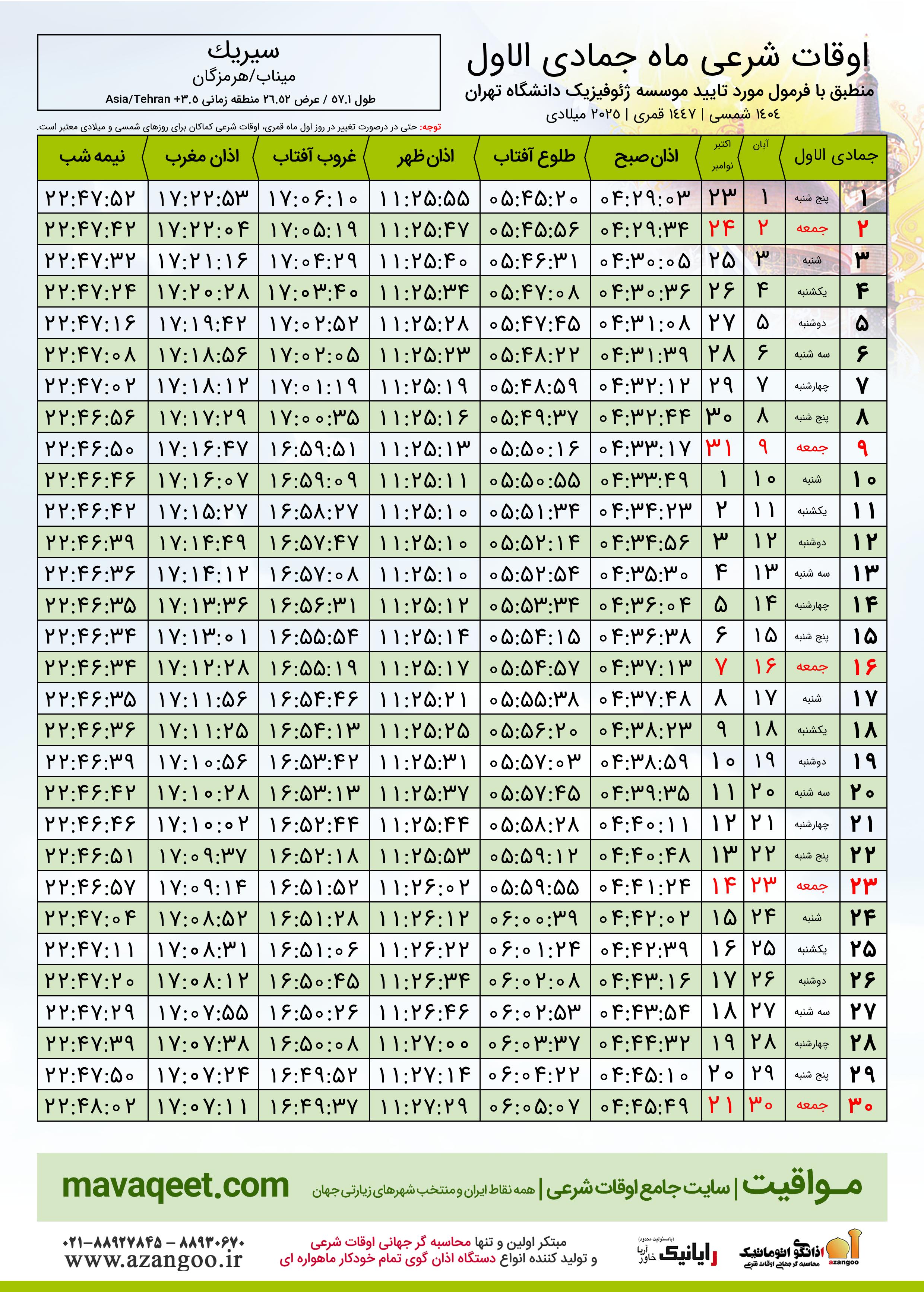 جدول اوقات شرعی جمادی الاول ١٤٤٧ قمری شهر سیریک