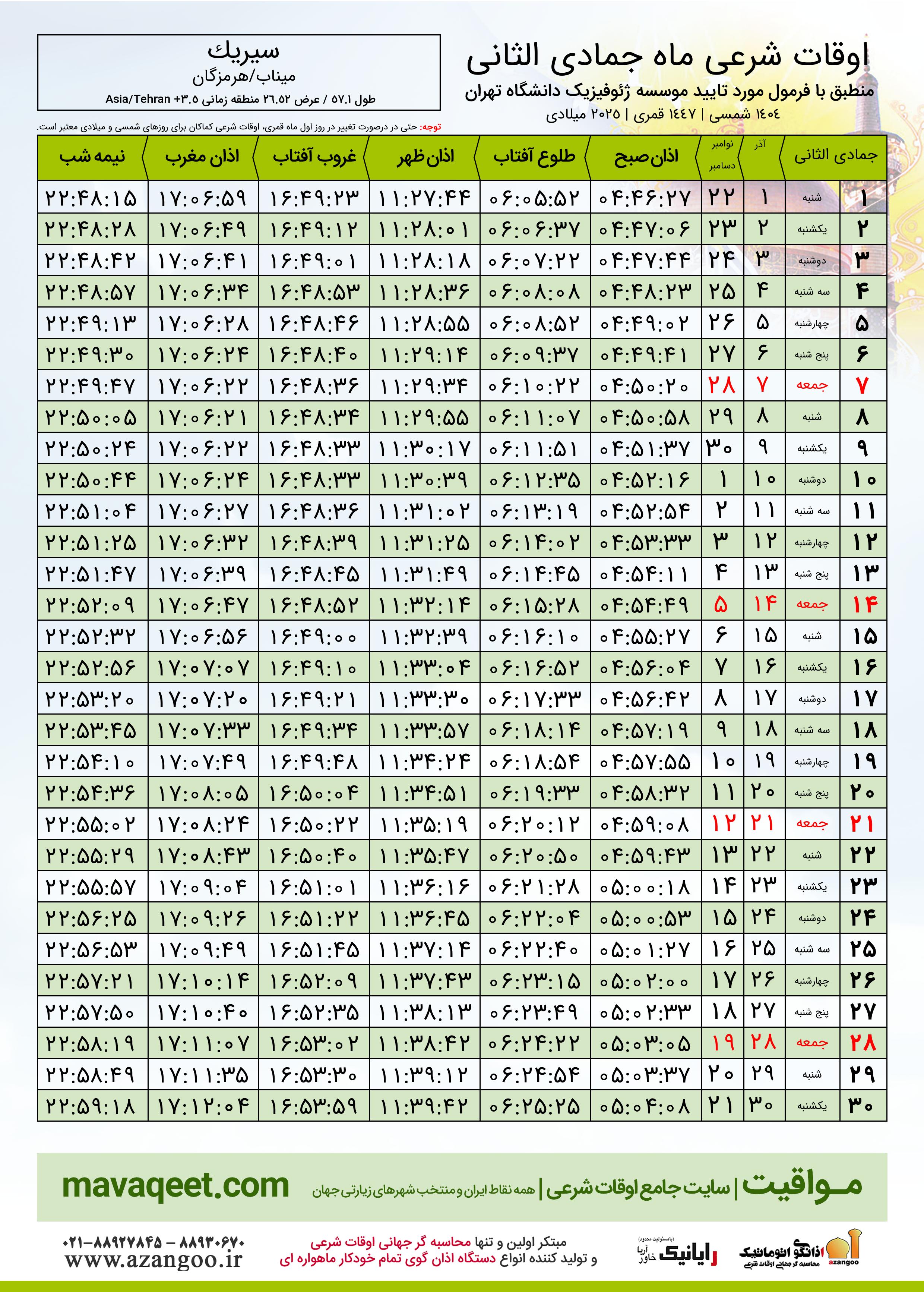 اوقات شرعی ماه جمادی الثانی ١٤٤٧ هـ.ق شهر سیریک بر