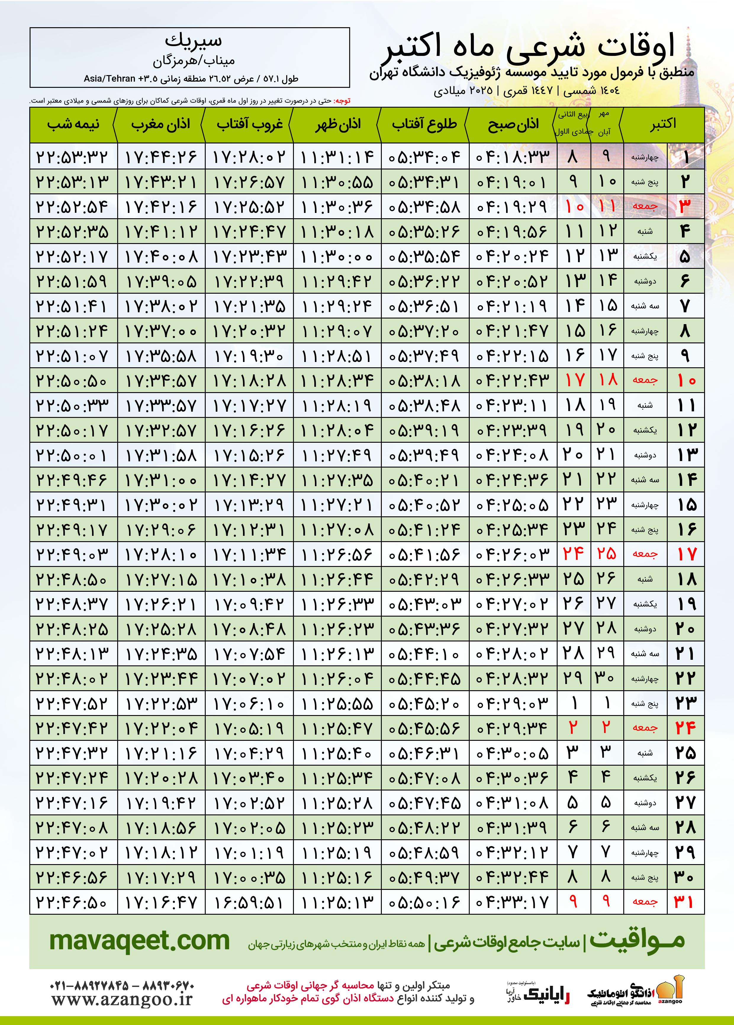 جهت نمایش تصویر جدول اوقات شرعی جدول اوقات شرعی اکتبر ٢٠٢٥ میلادی شهر سیریک شهر سیریک در اندازه