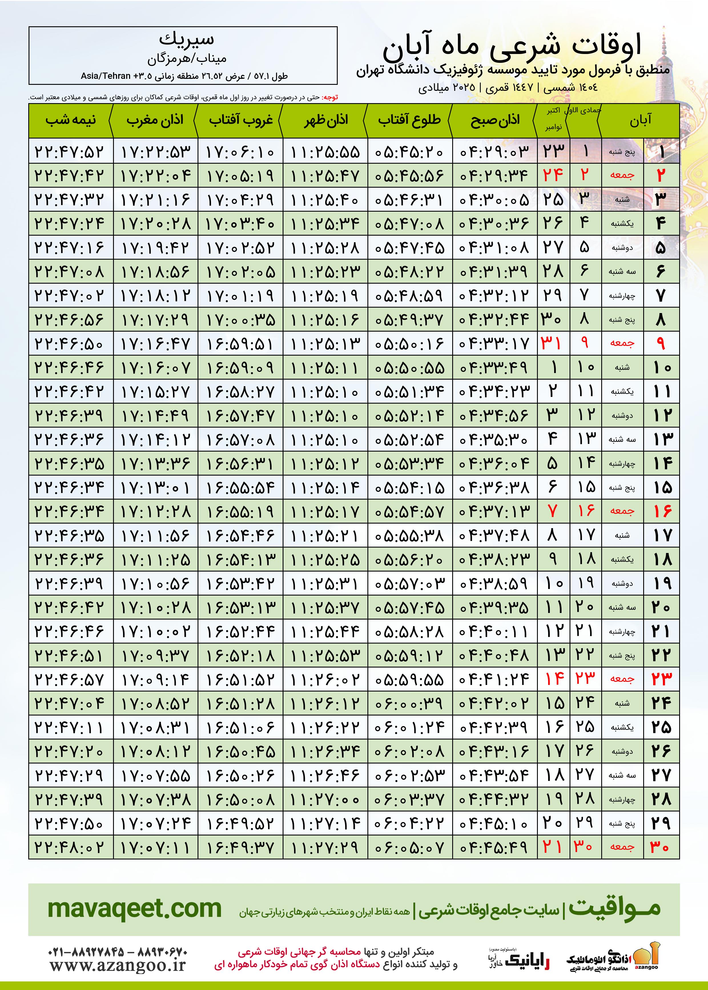 جدول اوقات شرعی آبان ١٤٠٤ شمسی شهر سیریک