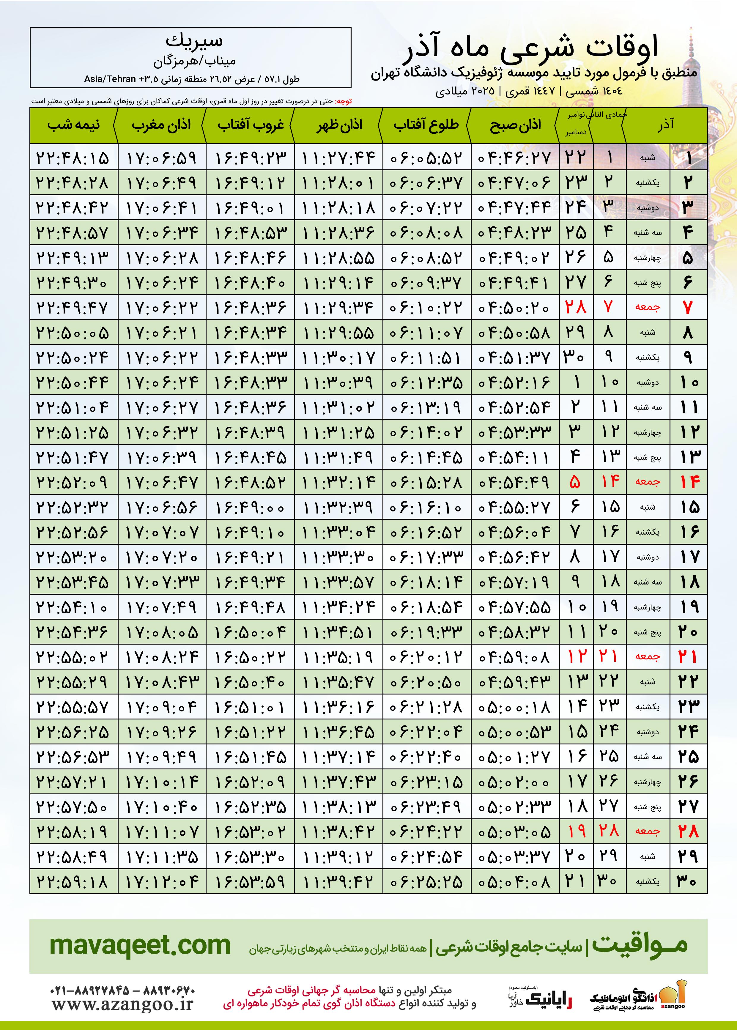 دانلود اوقات شرعی آذر ٠٤ - ١٤٠٤ شهر سیریک