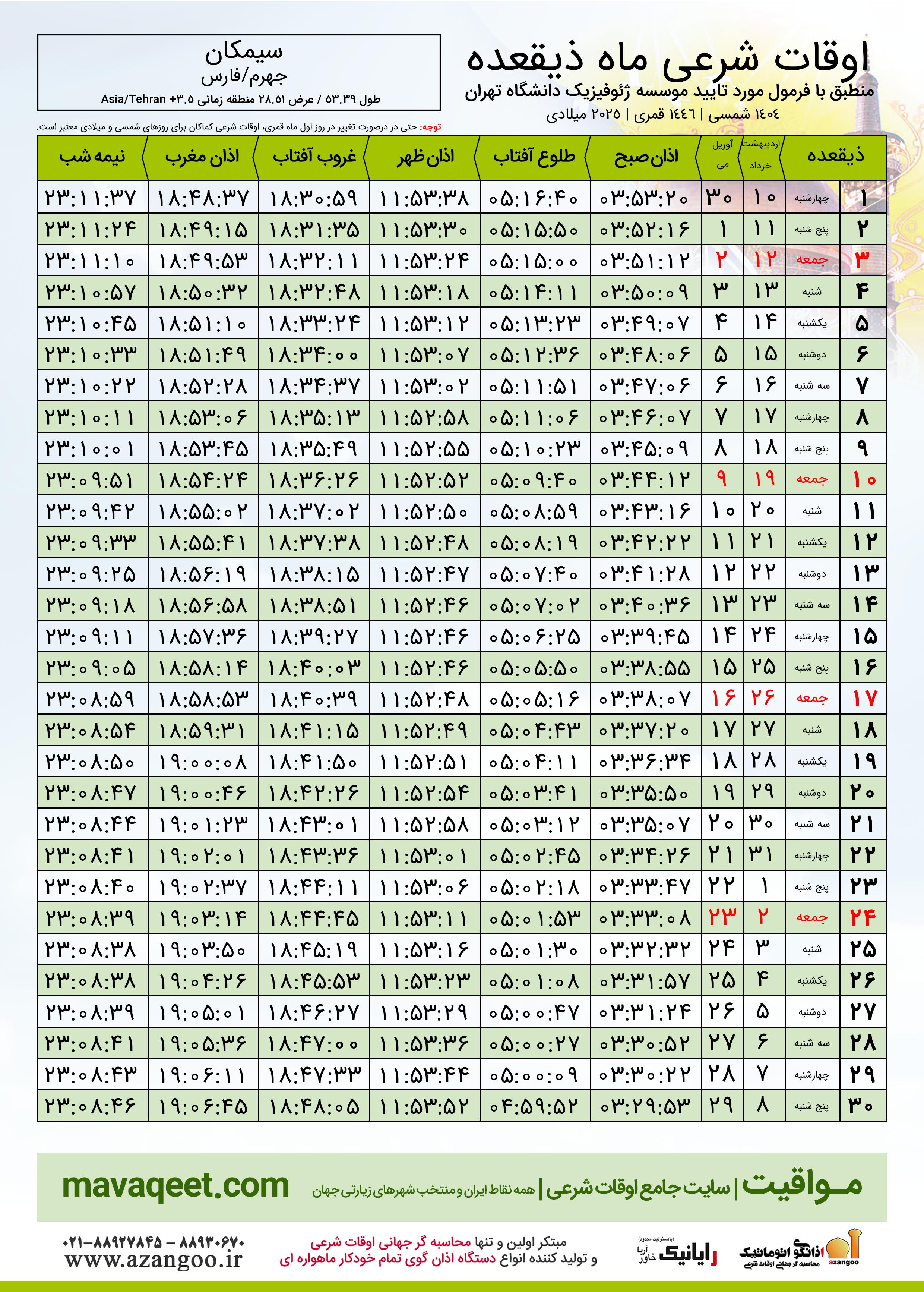 دانلود اوقات شرعی ماه رمضان ٠٤ - ١٤٠٤ شمسی | ٢٠٢٦ میلادی | ١٤٤٧ قمری شهر سیمکان