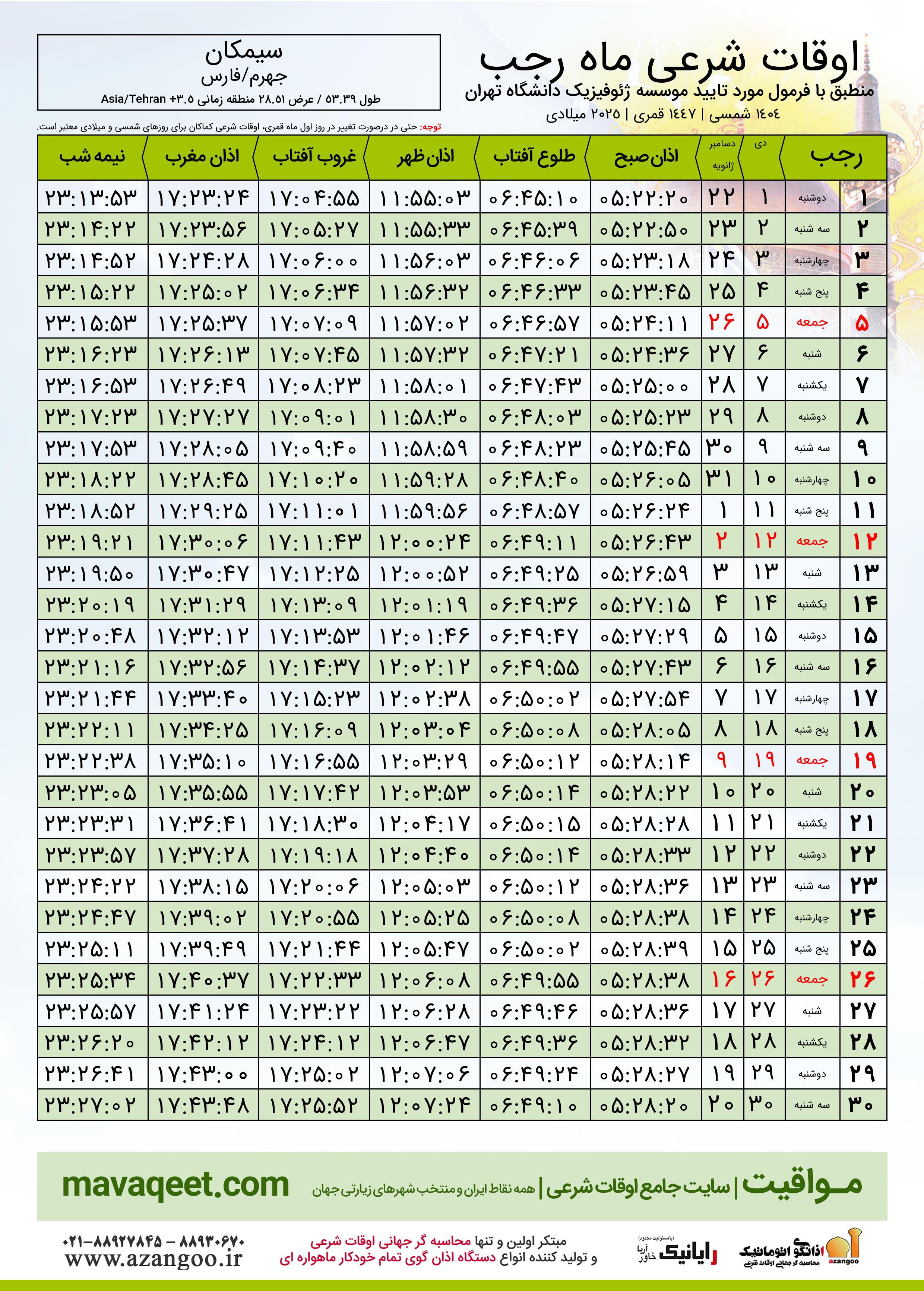 اوقات شرعی ماه رجب ١٤٤٧ هـ.ق شهر سیمکان بر