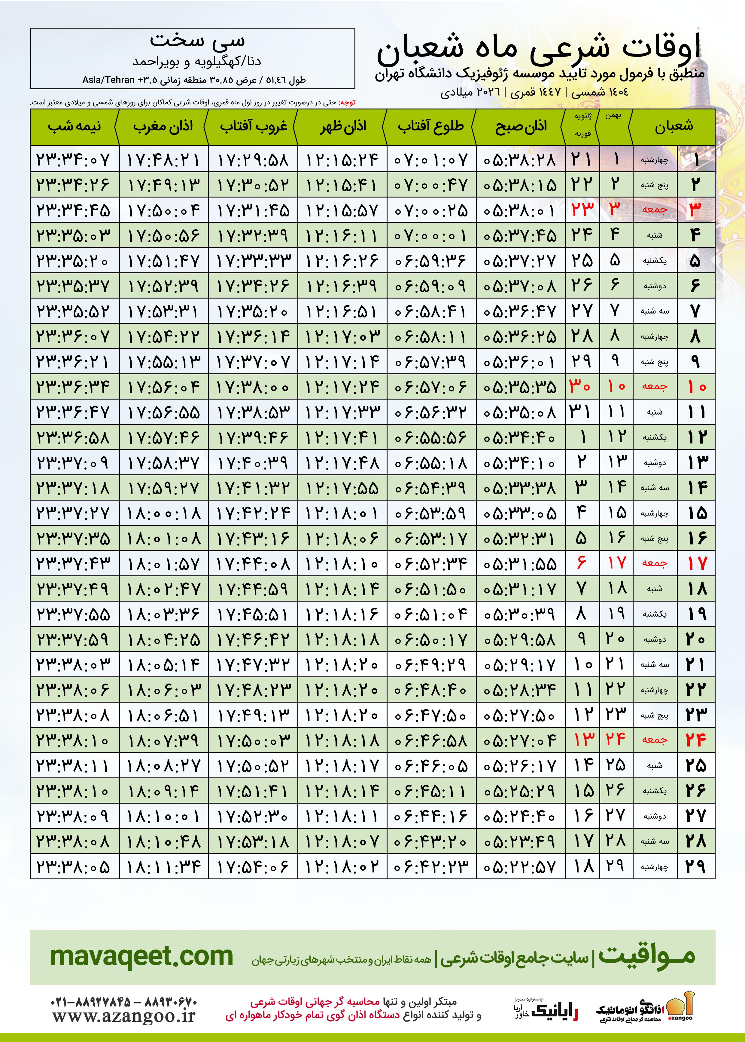 جدول اوقات شرعی شعبان ١٤٤٧ قمری شهر سی سخت