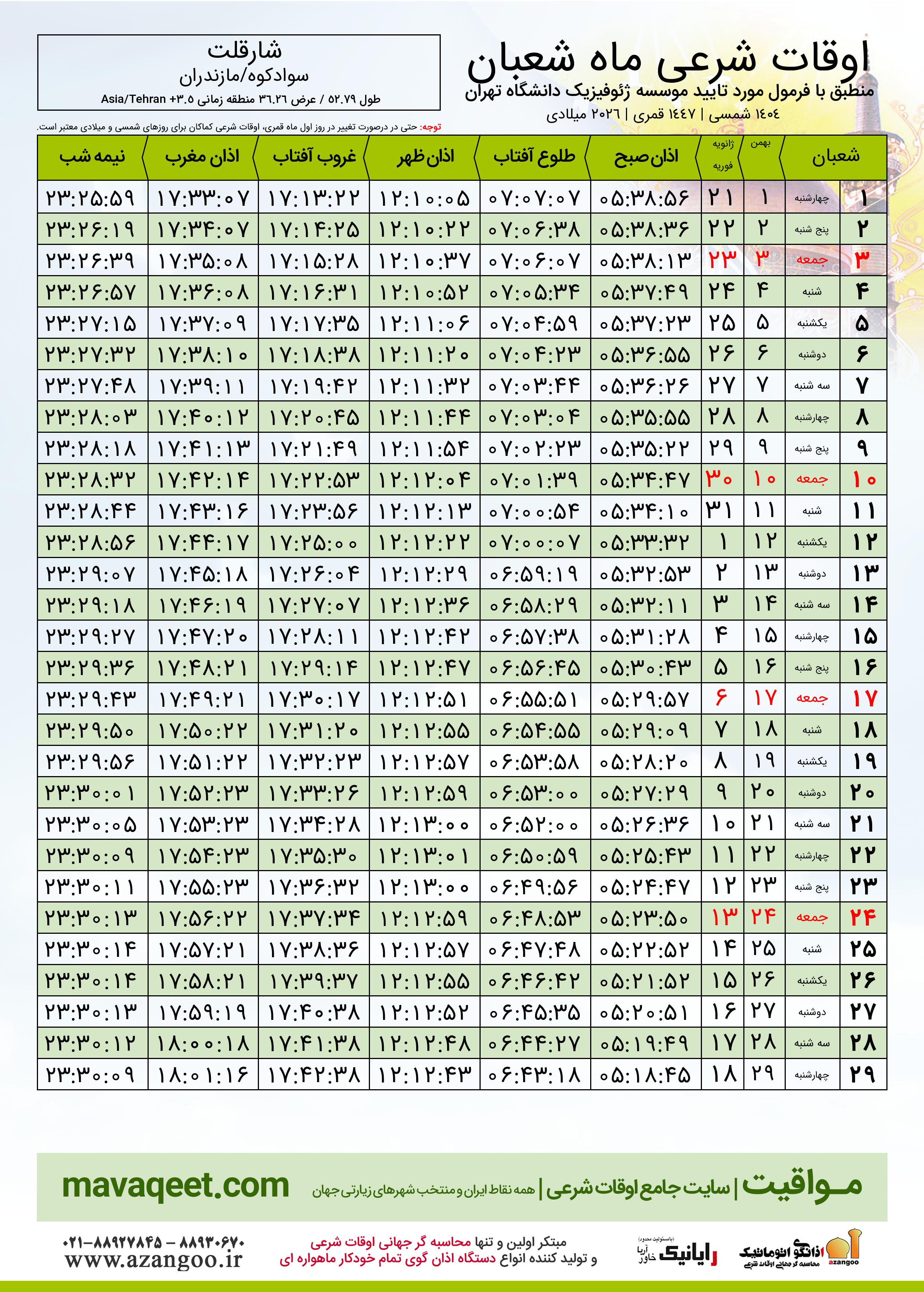 اوقات شرعی ماه شعبان ١٤٤٧ هـ.ق شهر شارقلت بر