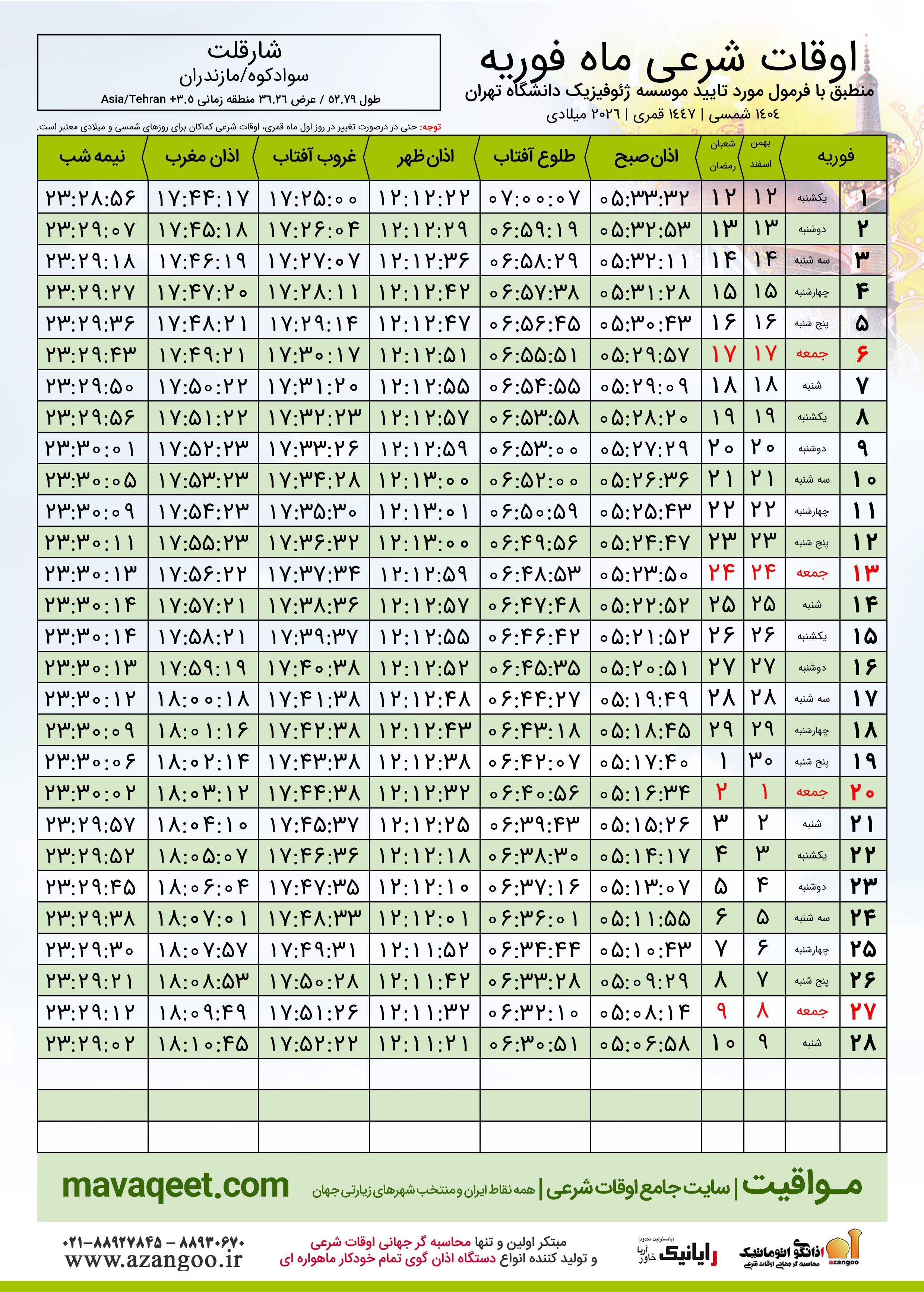 دانلود اوقات شرعی ماه رمضان ٠٤ - ١٤٠٤ شمسی | ٢٠٢٦ میلادی | ١٤٤٧ قمری شهر شارقلت