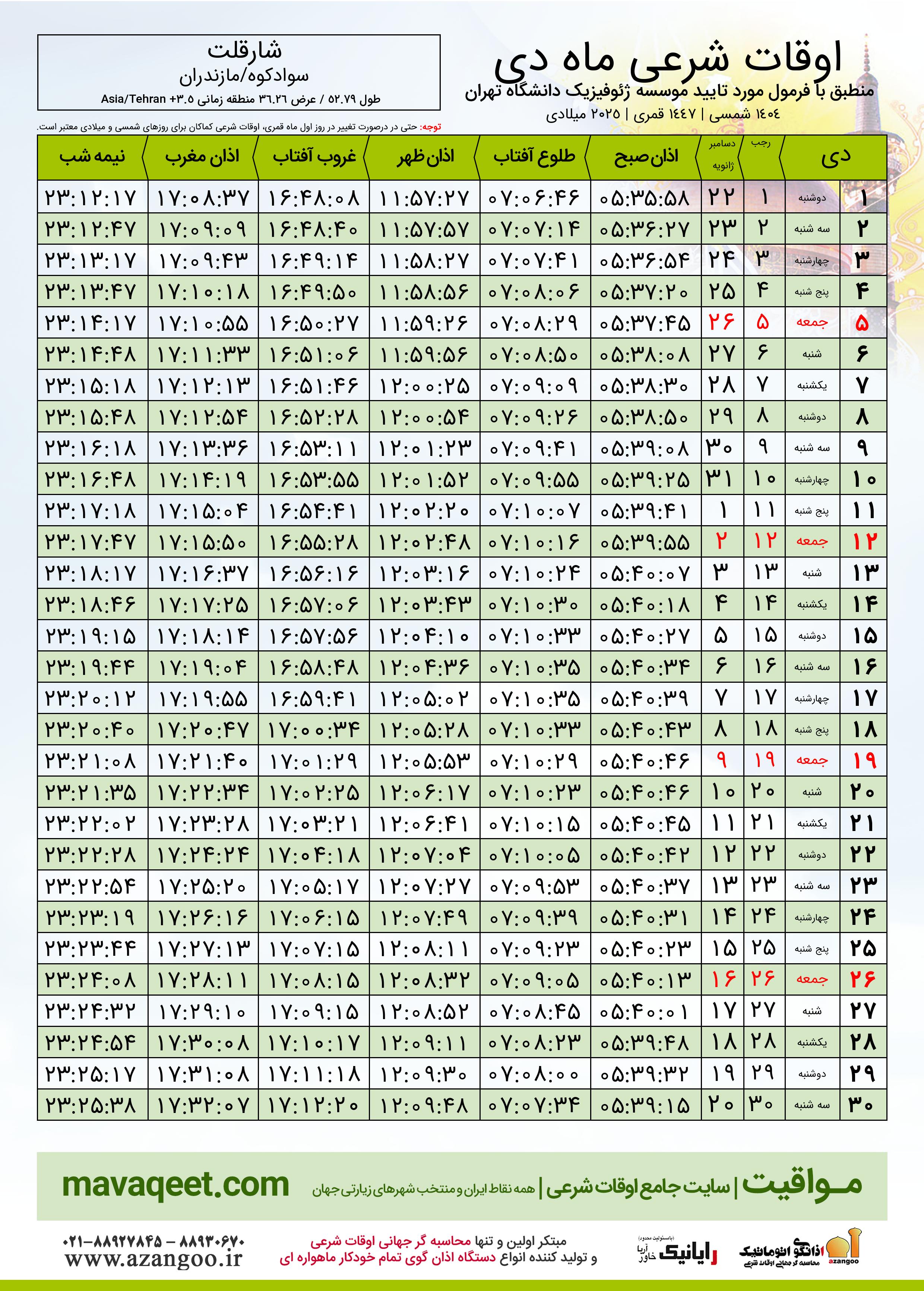 دانلود اوقات شرعی دی ٠٤ - ١٤٠٤ شهر شارقلت