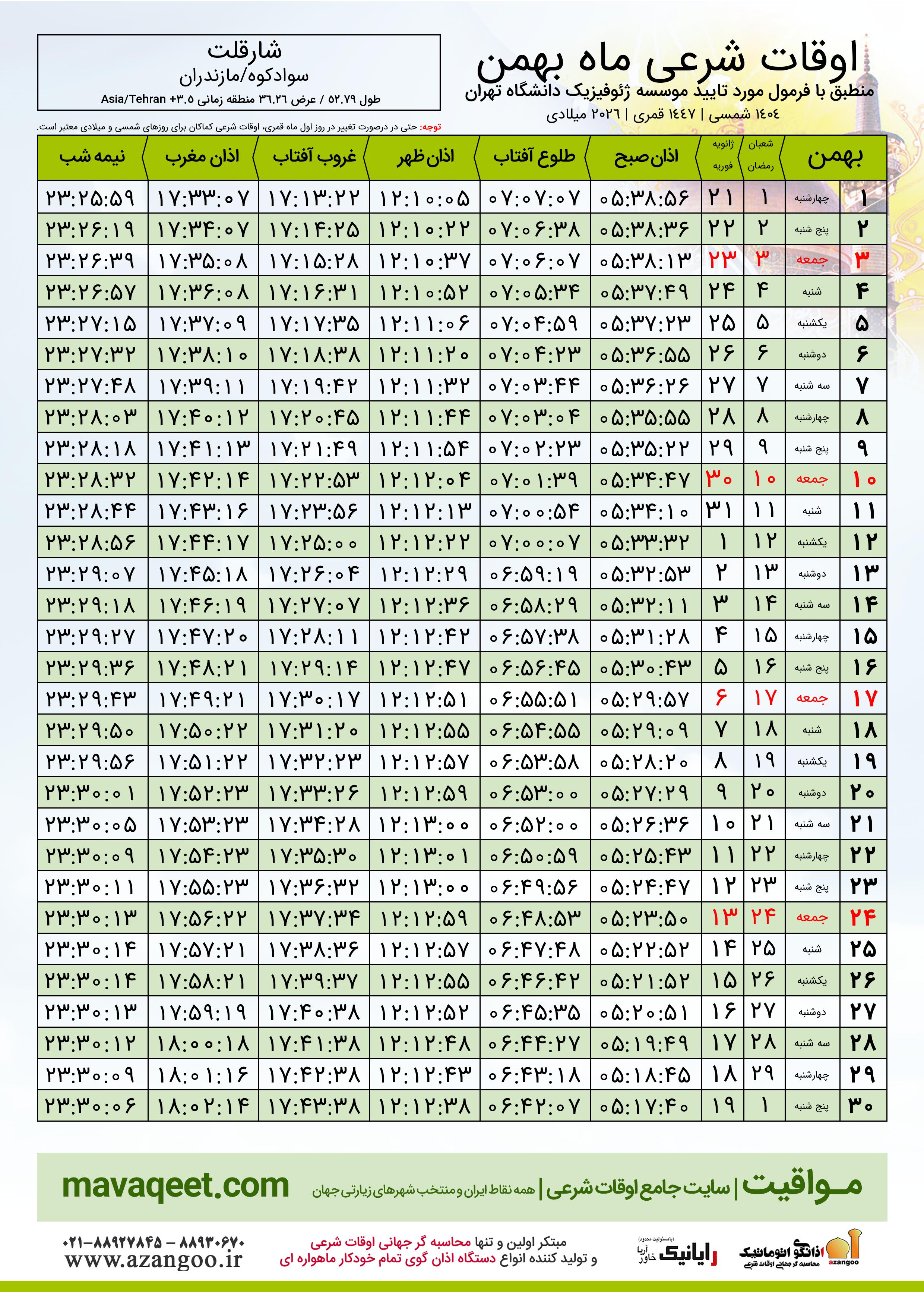 دانلود اوقات شرعی بهمن ٠٤ - ١٤٠٤ شهر شارقلت