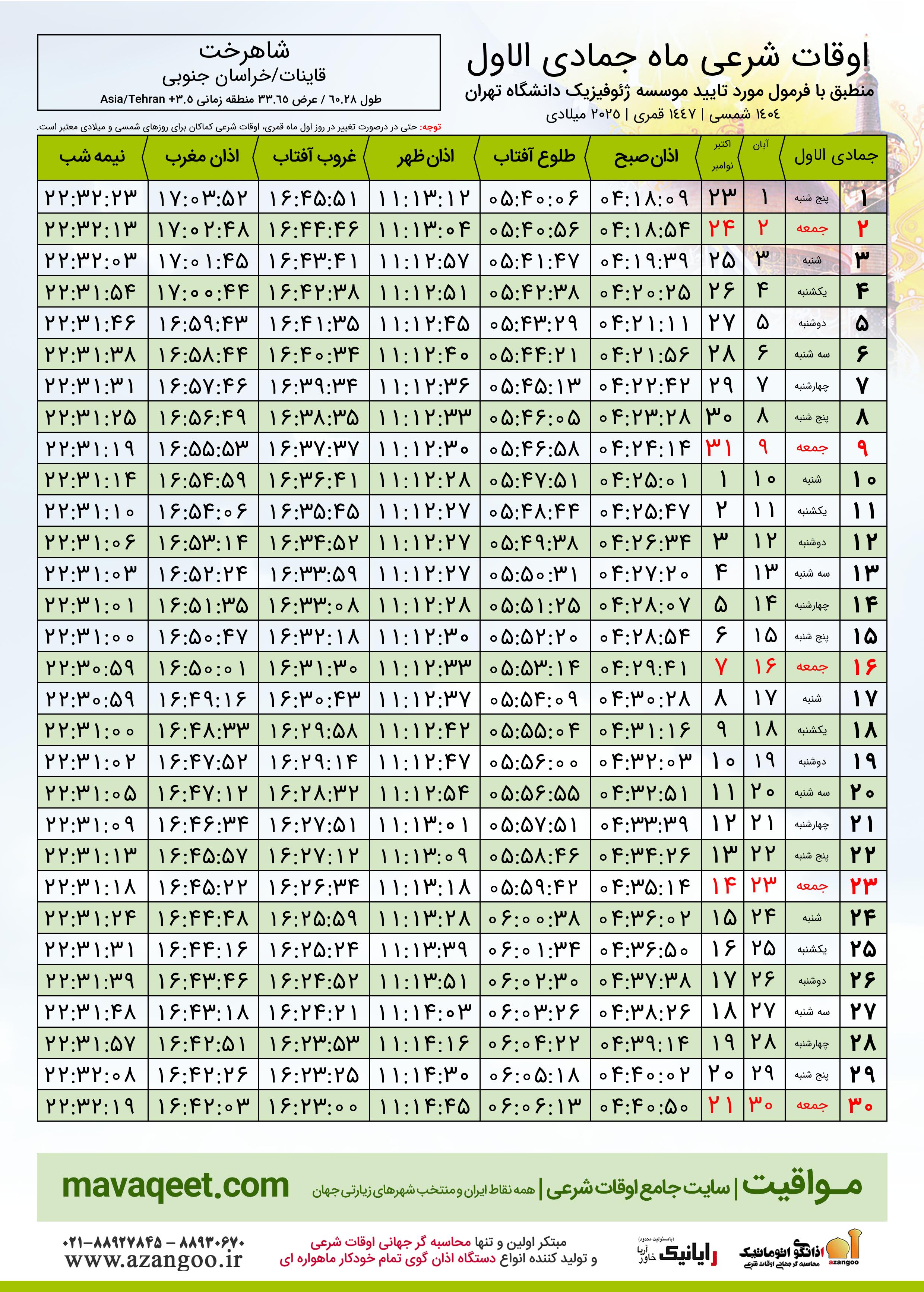 اوقات شرعی ماه جمادی الاول ١٤٤٧ هـ.ق شهر شاهرخت بر