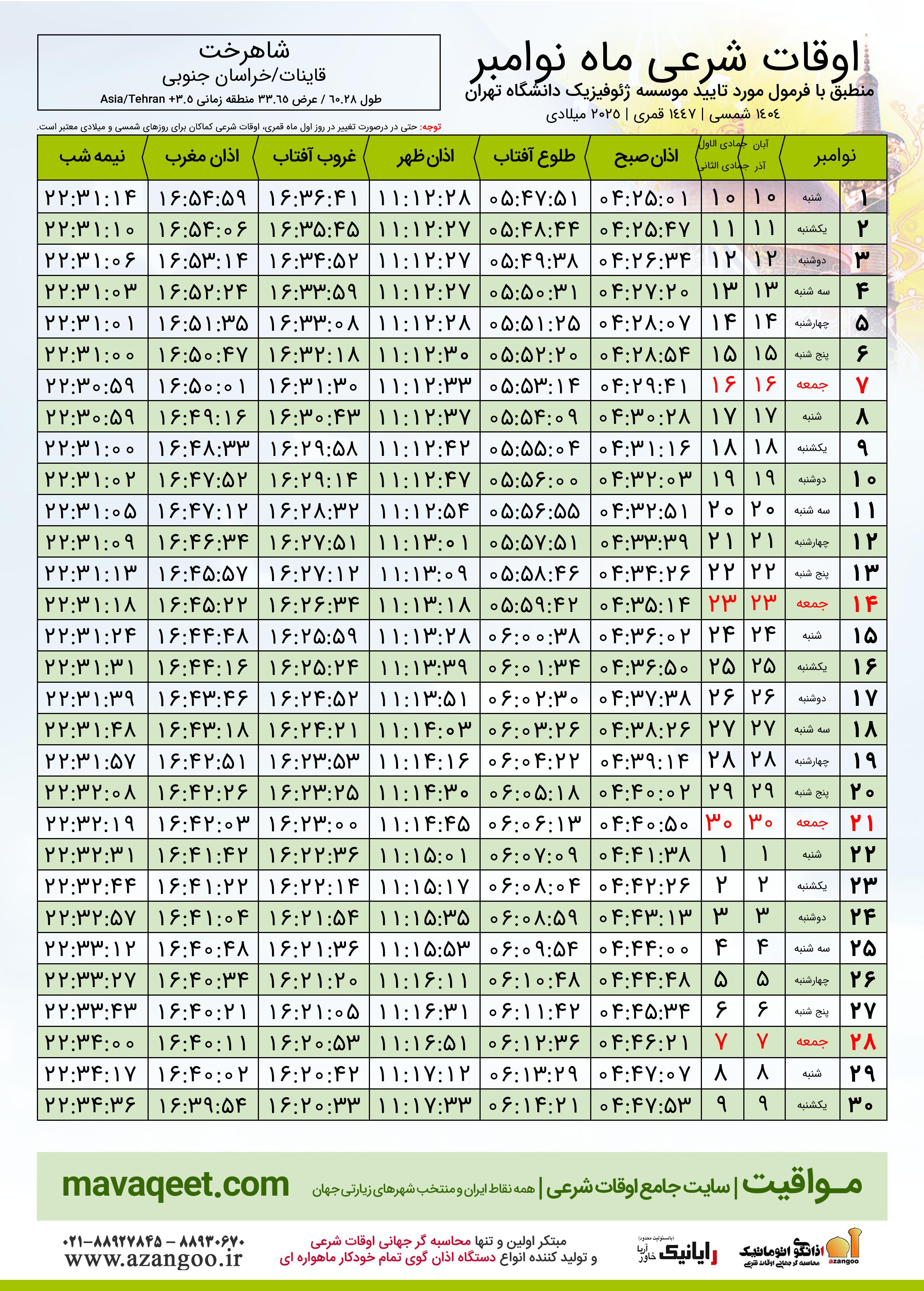 جهت نمایش تصویر جدول اوقات شرعی جدول اوقات شرعی نوامبر ٢٠٢٥ میلادی شهر شاهرخت شهر شاهرخت در اندازه