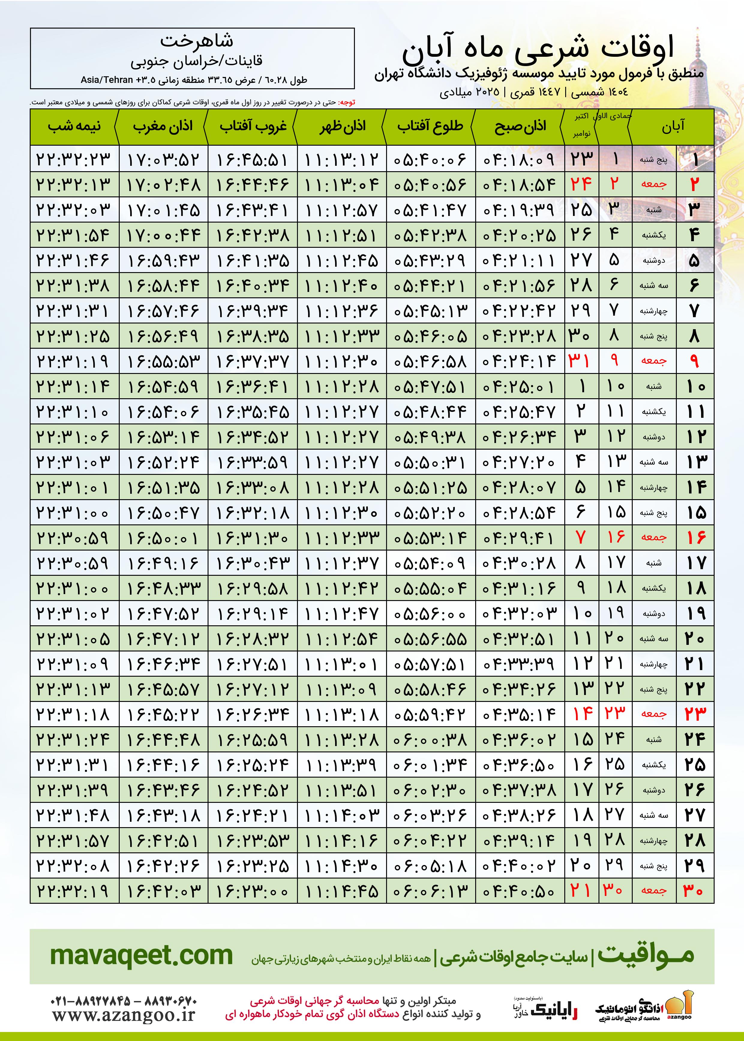 جدول اوقات شرعی آبان ١٤٠٤ شمسی شهر شاهرخت