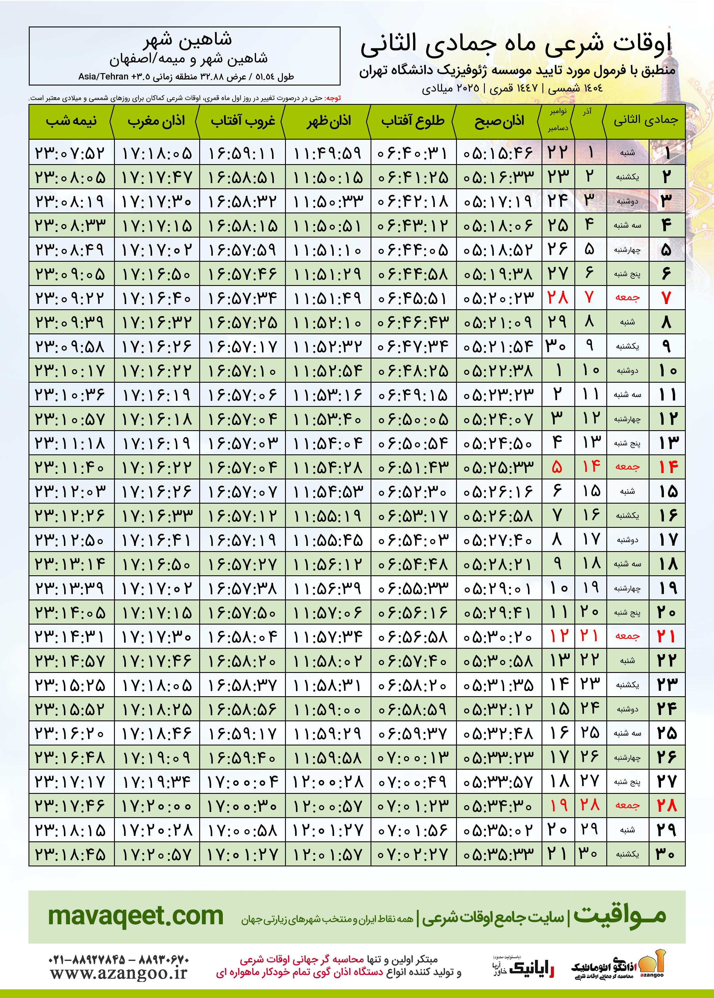 اوقات شرعی جمادی الثانی ١٤٤٧ قمری شهر شاهین شهر