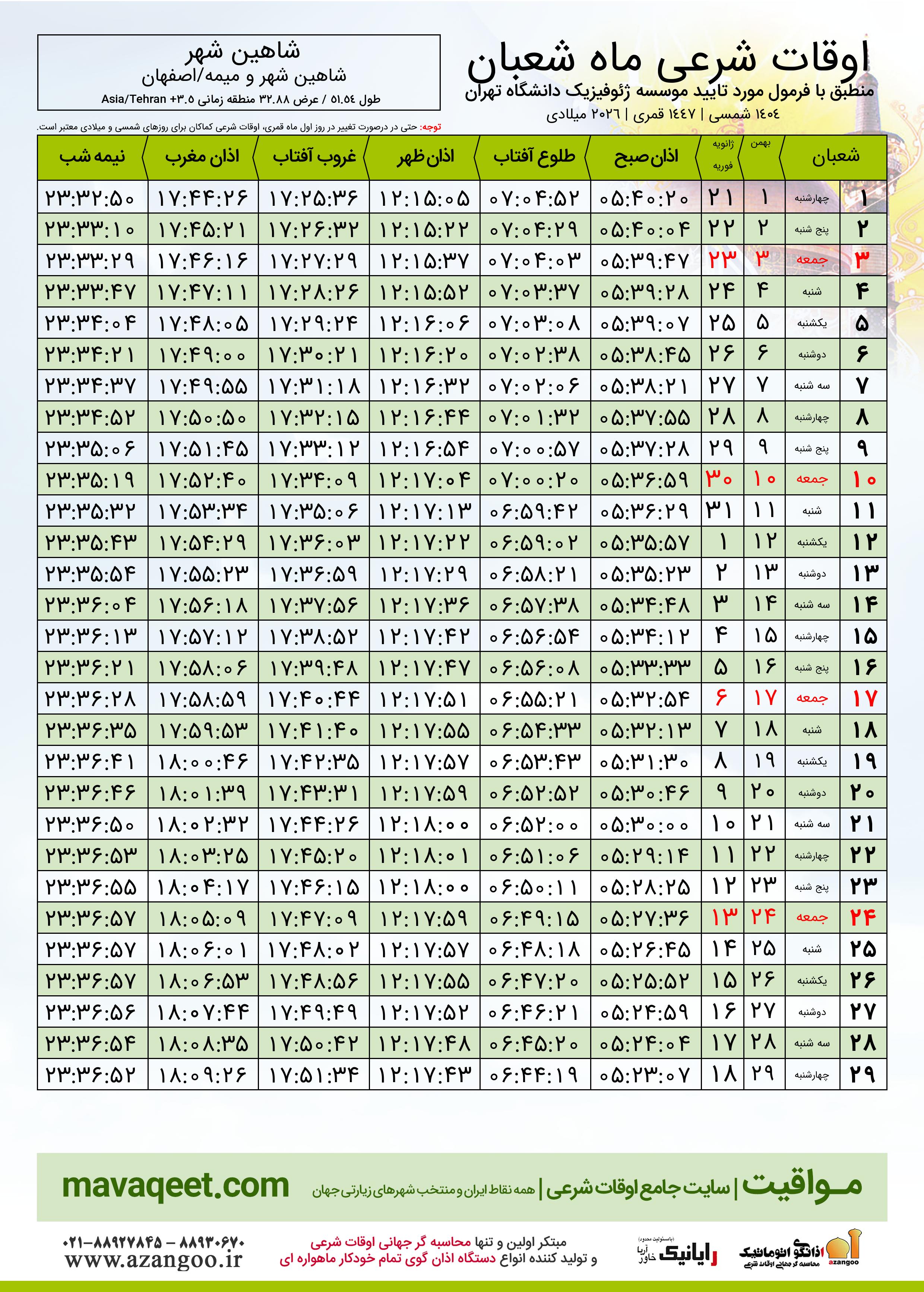 اوقات شرعی ماه شعبان ١٤٤٧ هـ.ق شهر شاهین شهر بر