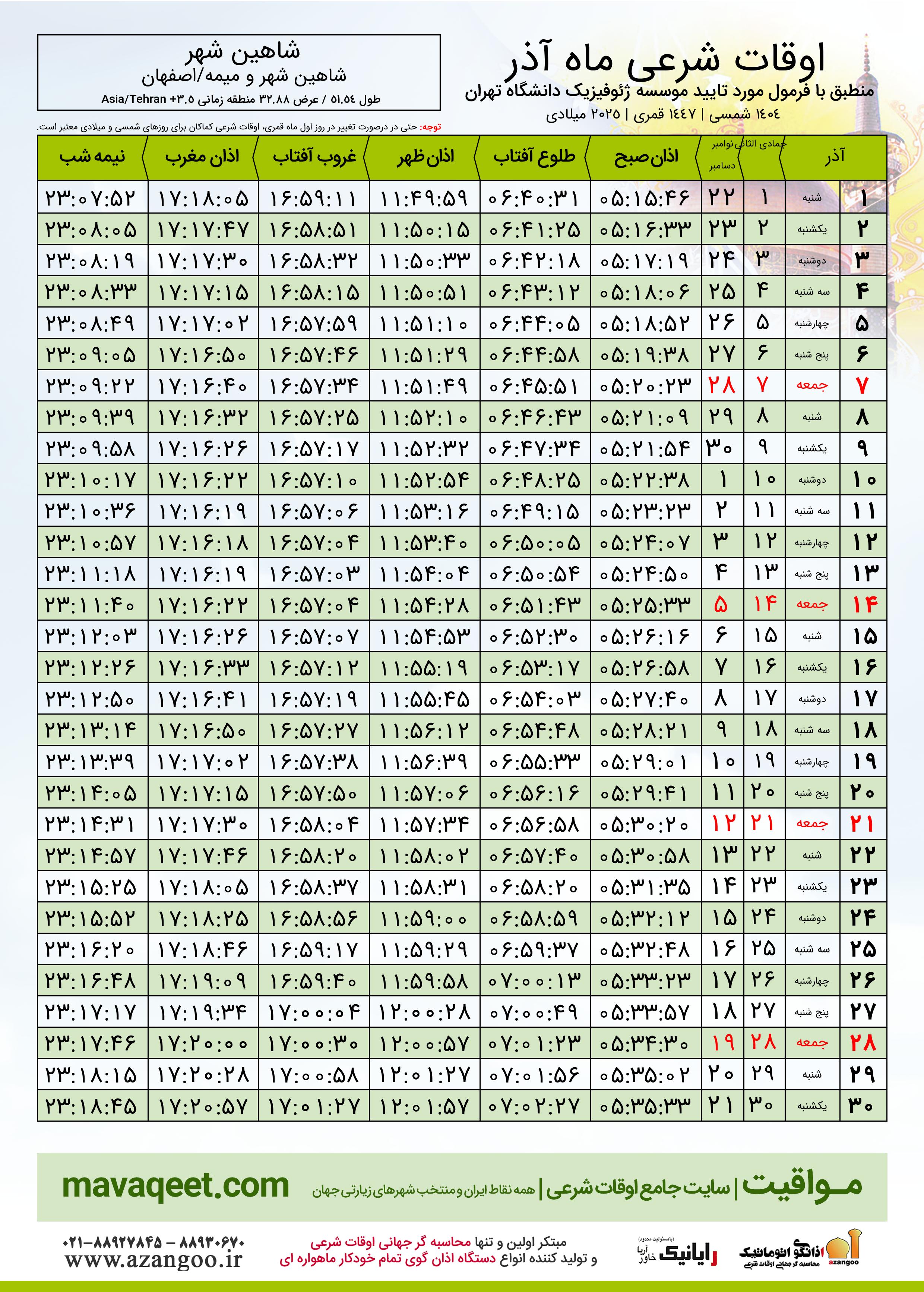اوقات شرعی آذر ١٤٠٤ شمسی شهر شاهین شهر