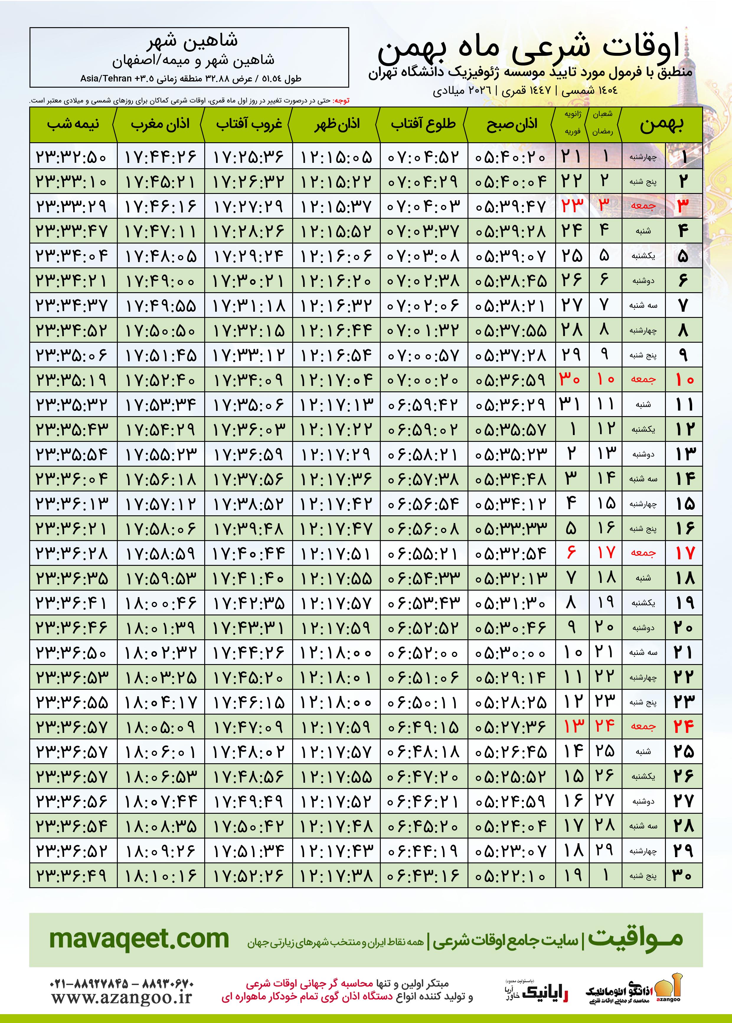 اوقات شرعی بهمن ١٤٠٤ شمسی شهر شاهین شهر