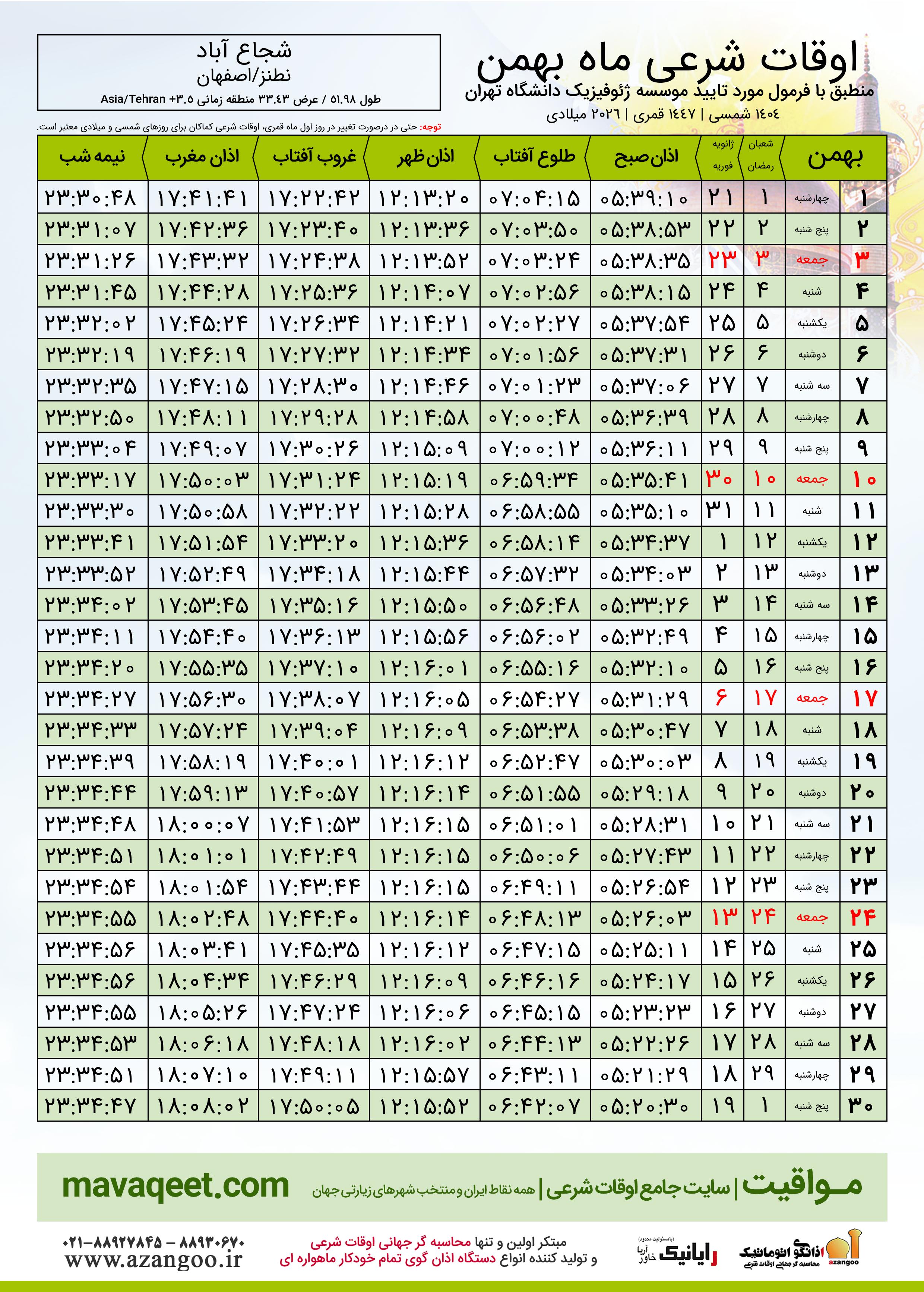 دانلود اوقات شرعی بهمن ٠٤ - ١٤٠٤ شهر شجاع آباد