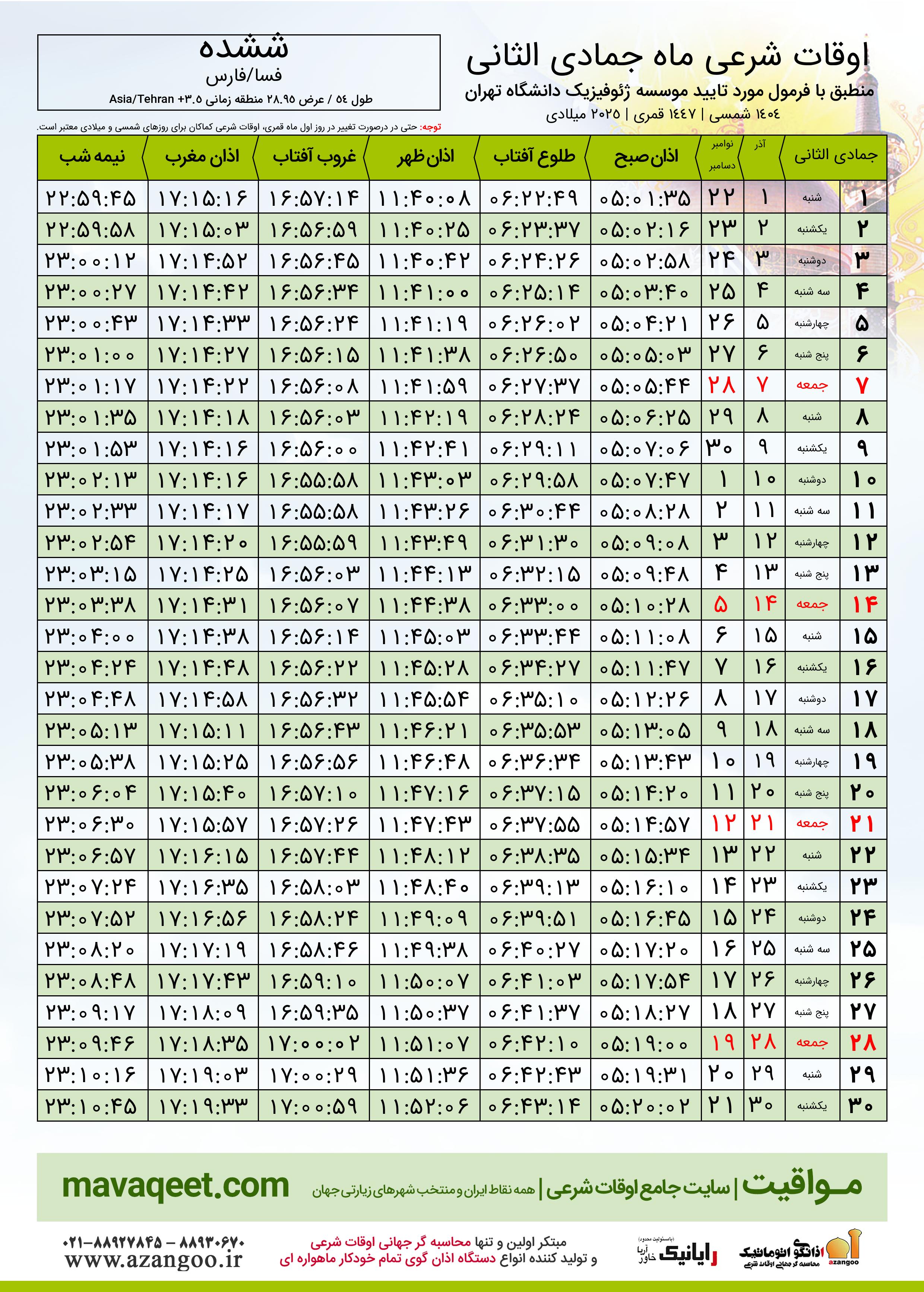 جدول اوقات شرعی جمادی الثانی ١٤٤٧ قمری شهر ششده