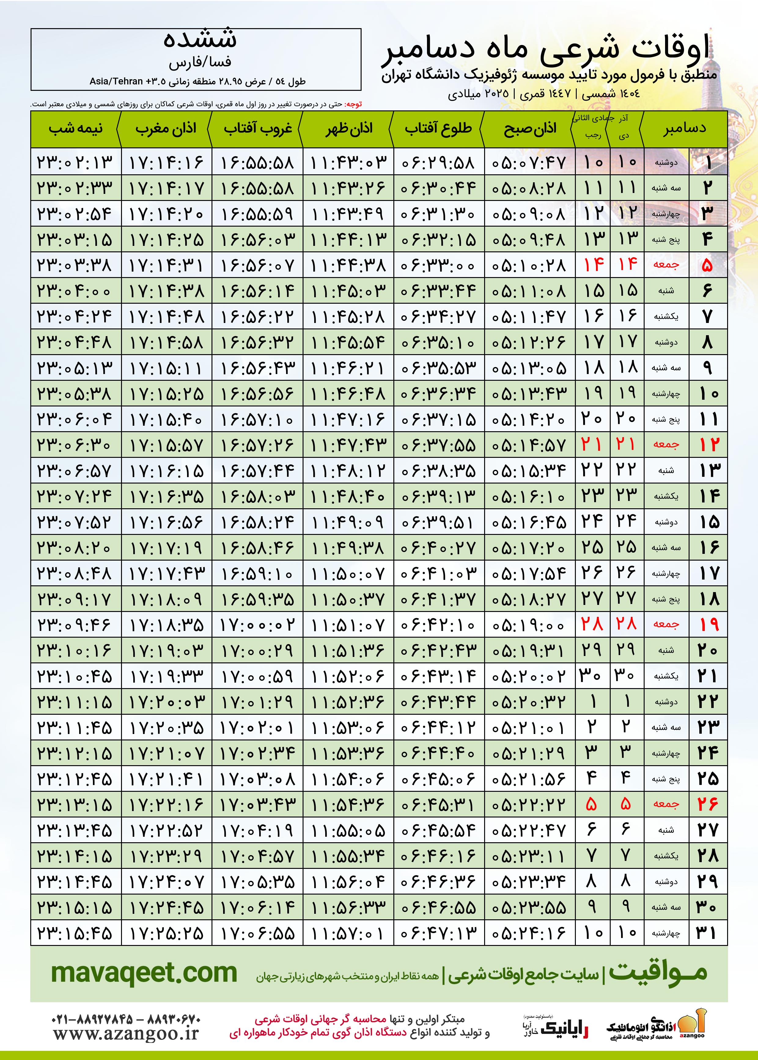 جدول اوقات شرعی دسامبر ٢٠٢٥ میلادی شهر ششده