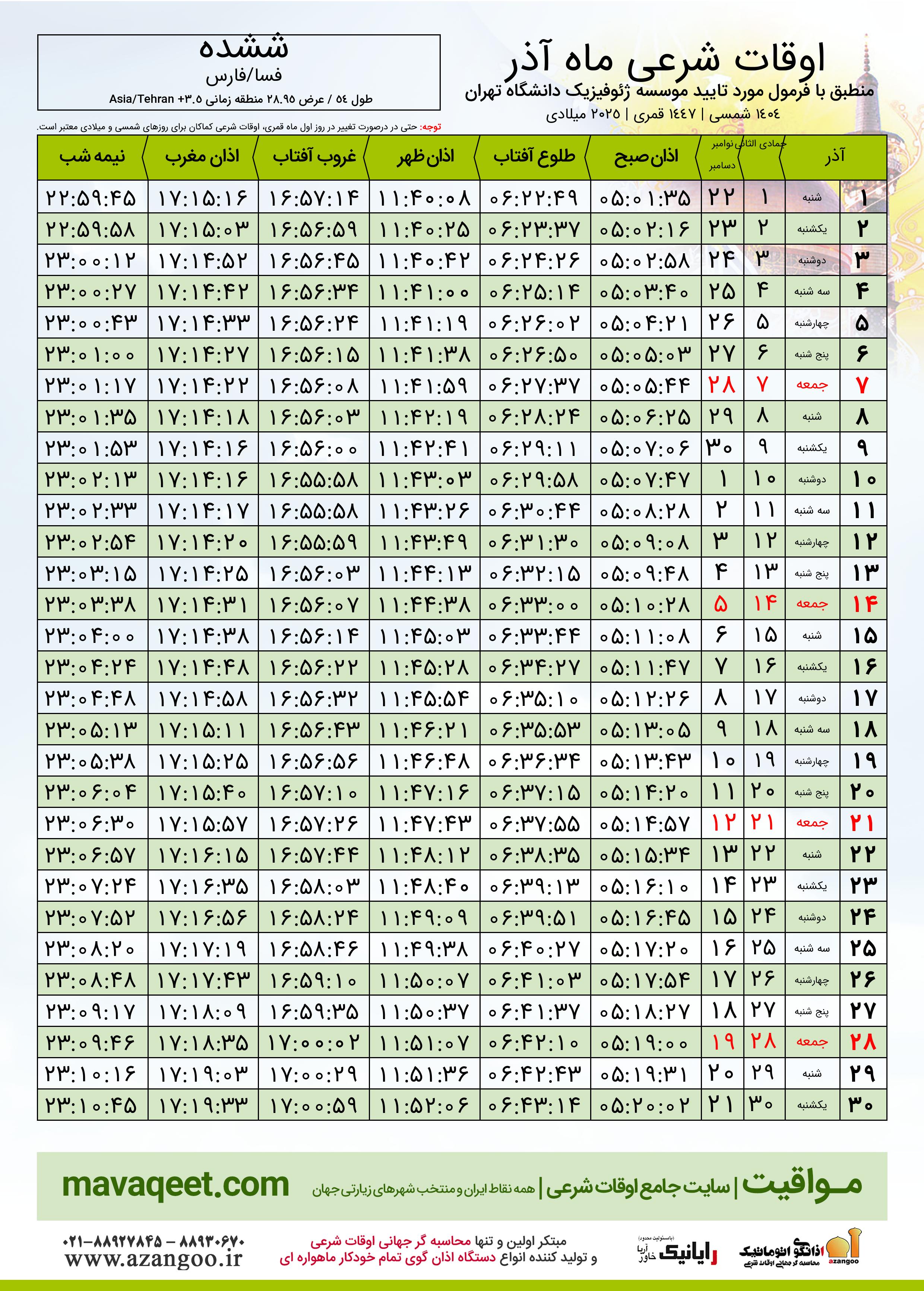 جدول اوقات شرعی آذر ١٤٠٤ شمسی شهر ششده