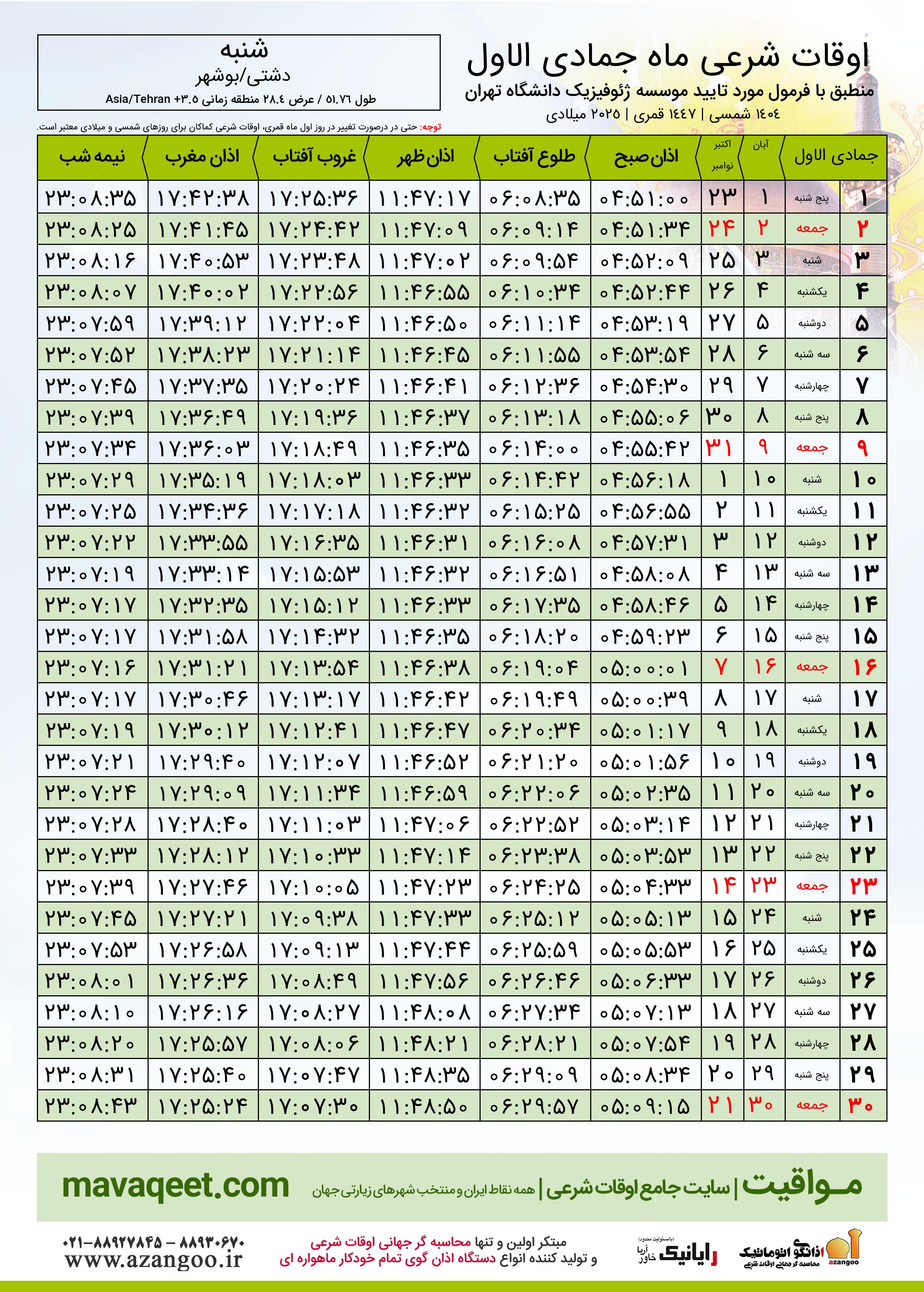 اوقات شرعی ماه جمادی الاول ١٤٤٧ هـ.ق شهر شنبه بر