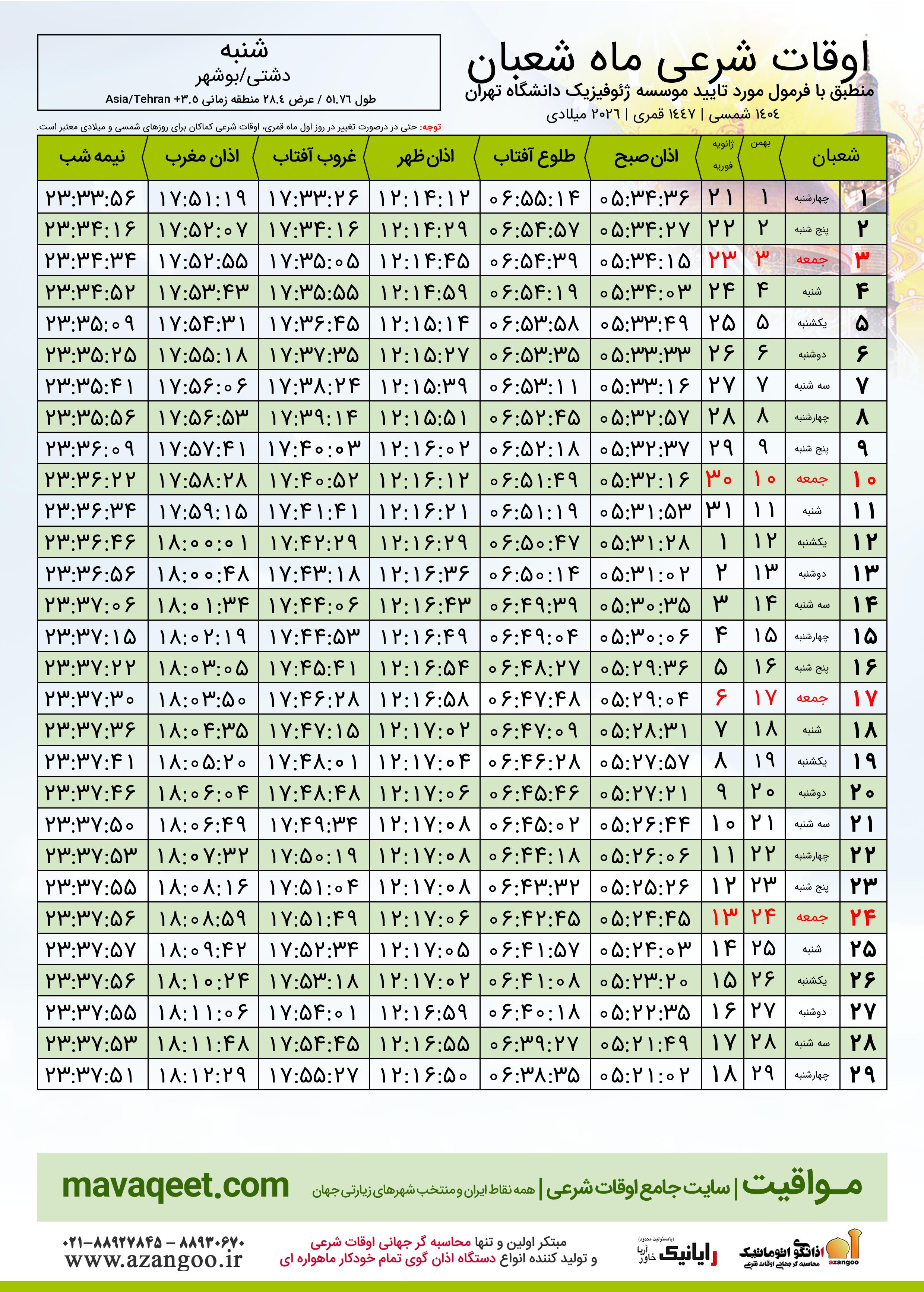 اوقات شرعی ماه شعبان ١٤٤٧ هـ.ق شهر شنبه بر
