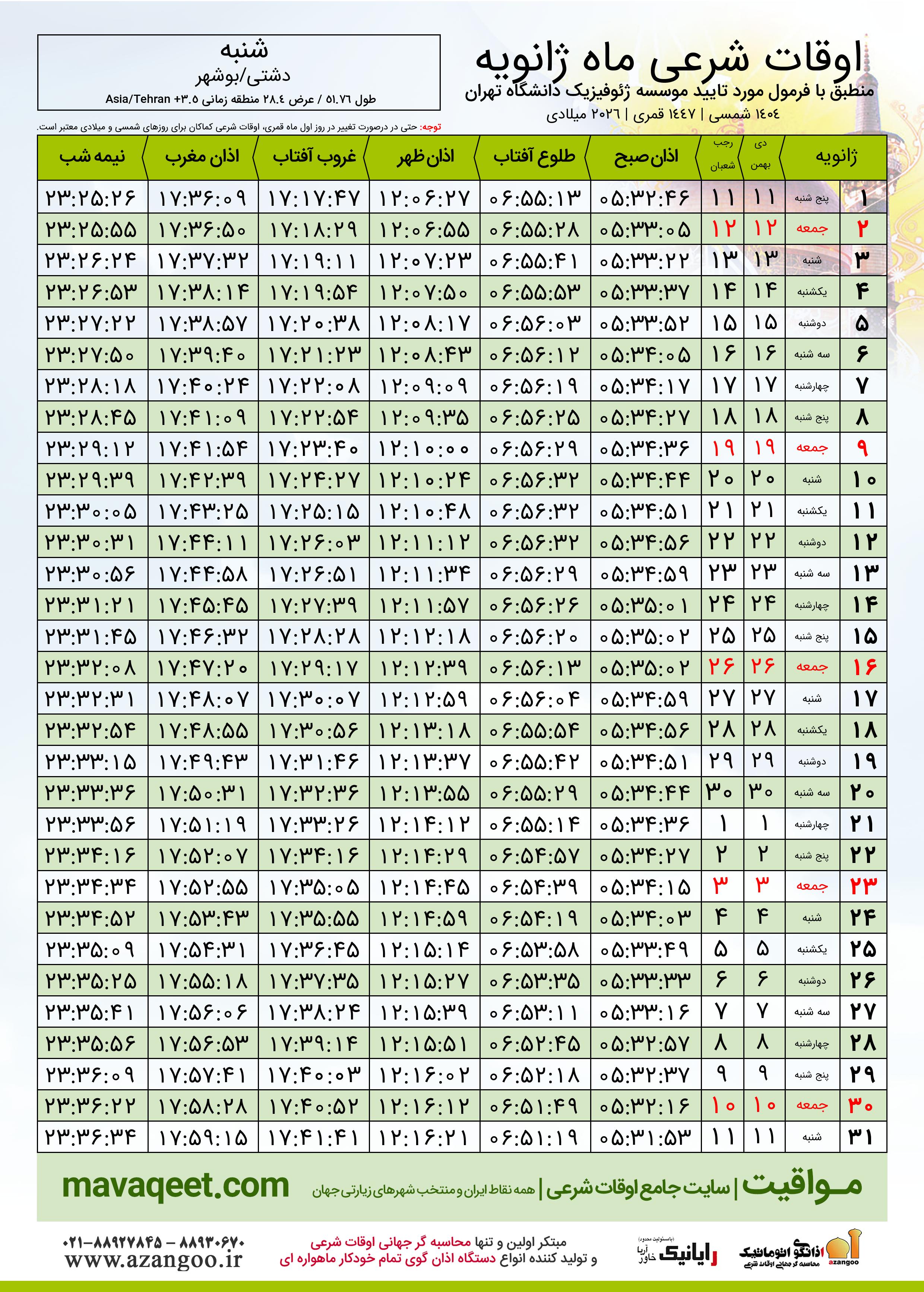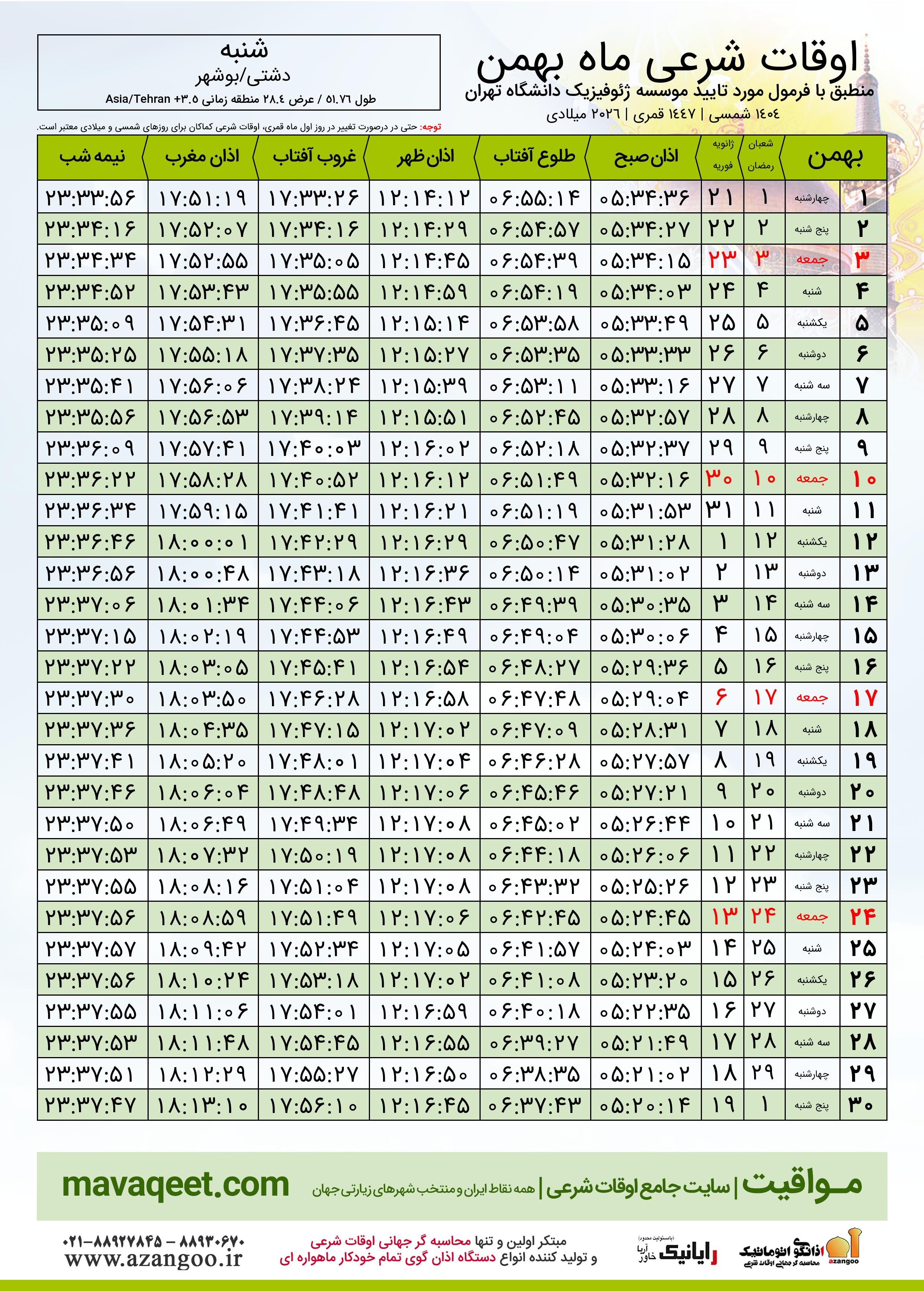 دانلود اوقات شرعی بهمن ٠٤ - ١٤٠٤ شهر شنبه
