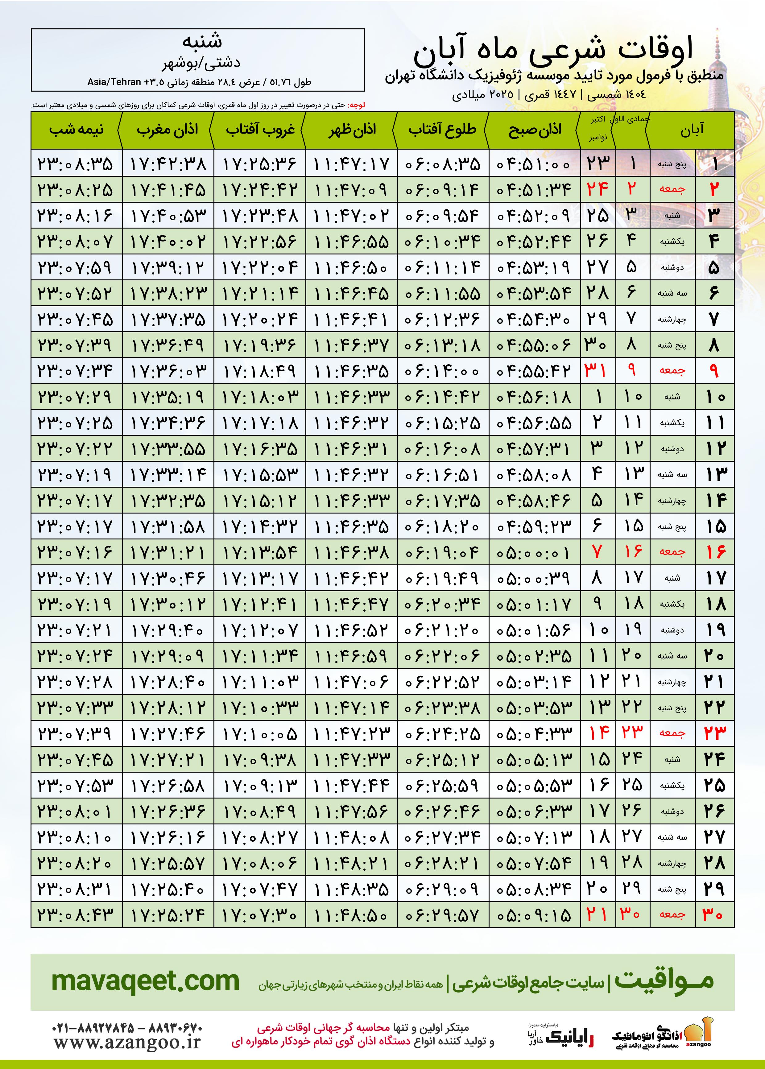 اوقات شرعی آبان ١٤٠٤ شمسی شهر شنبه