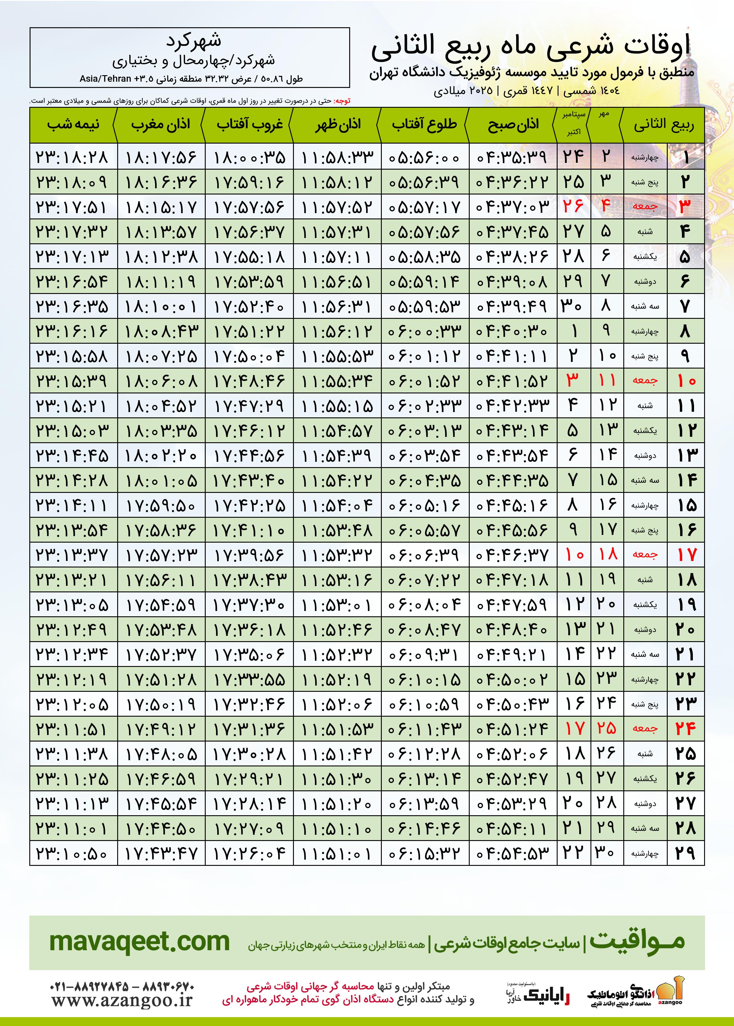 جدول اوقات شرعی ربیع الثانی ١٤٤٧ قمری شهر شهرکرد