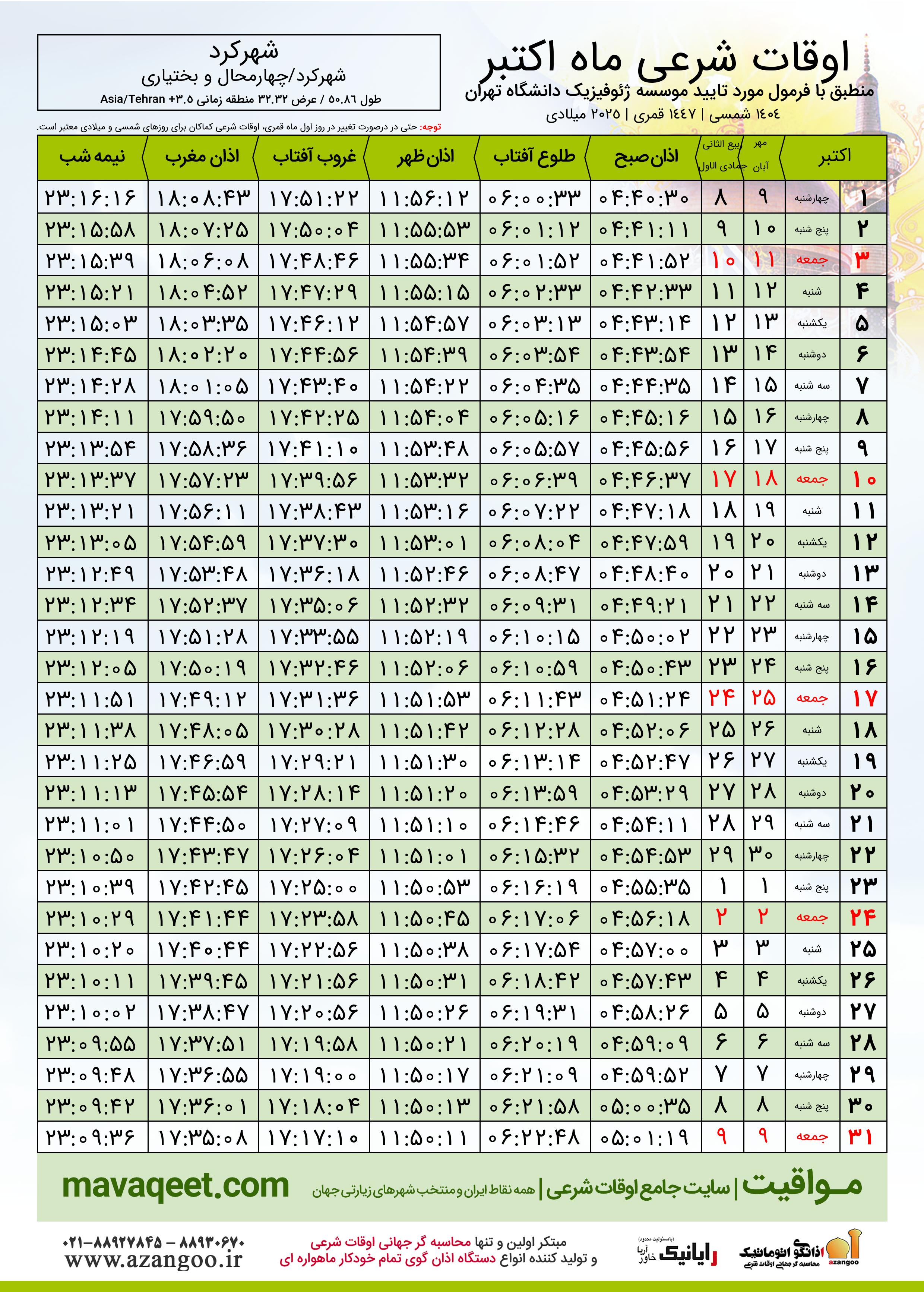 اوقات شرعی اکتبر ٢٠٢٥ میلادی شهر شهرکرد