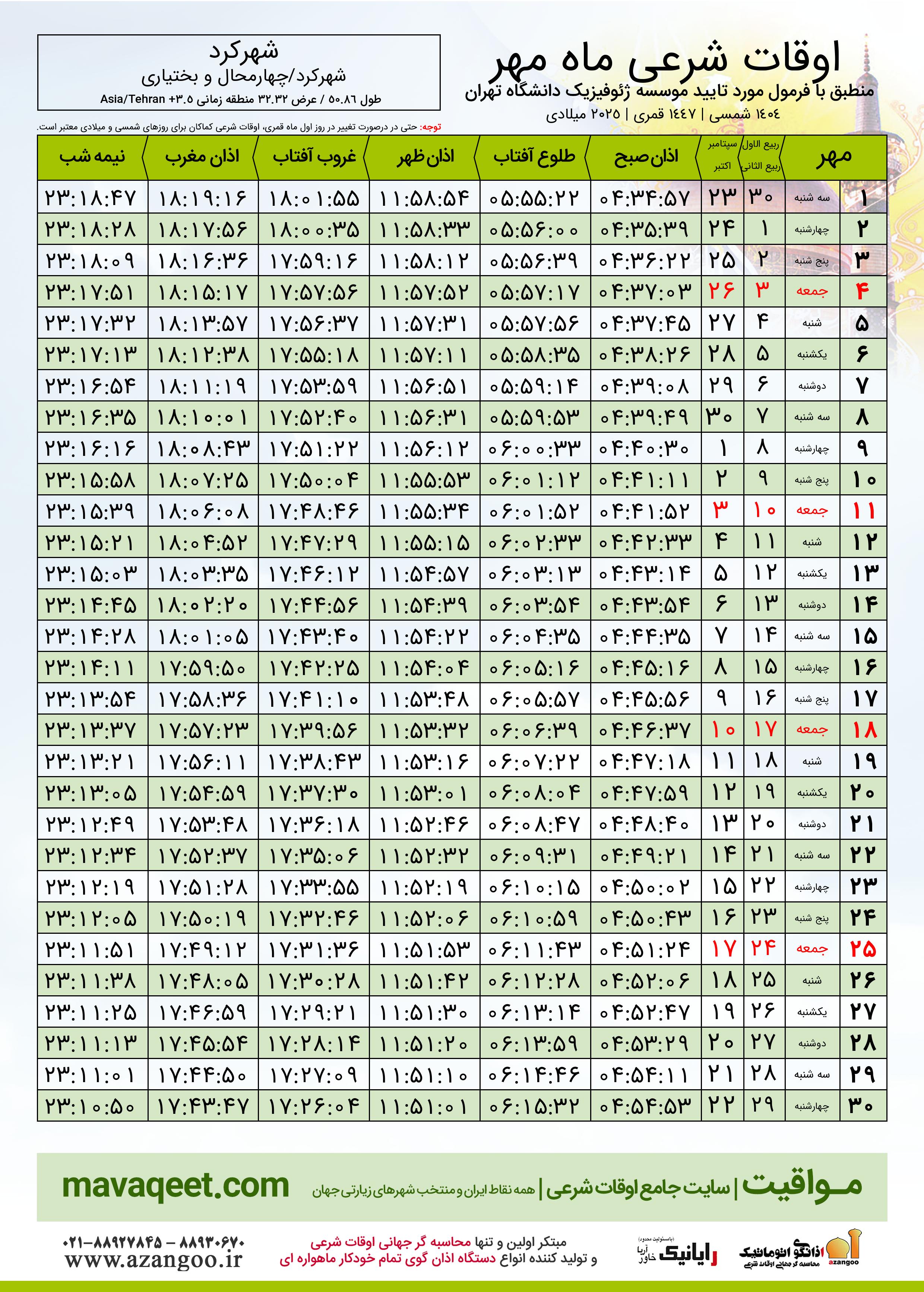 دانلود اوقات شرعی مهر ٠٤ - ١٤٠٤ شهر شهرکرد