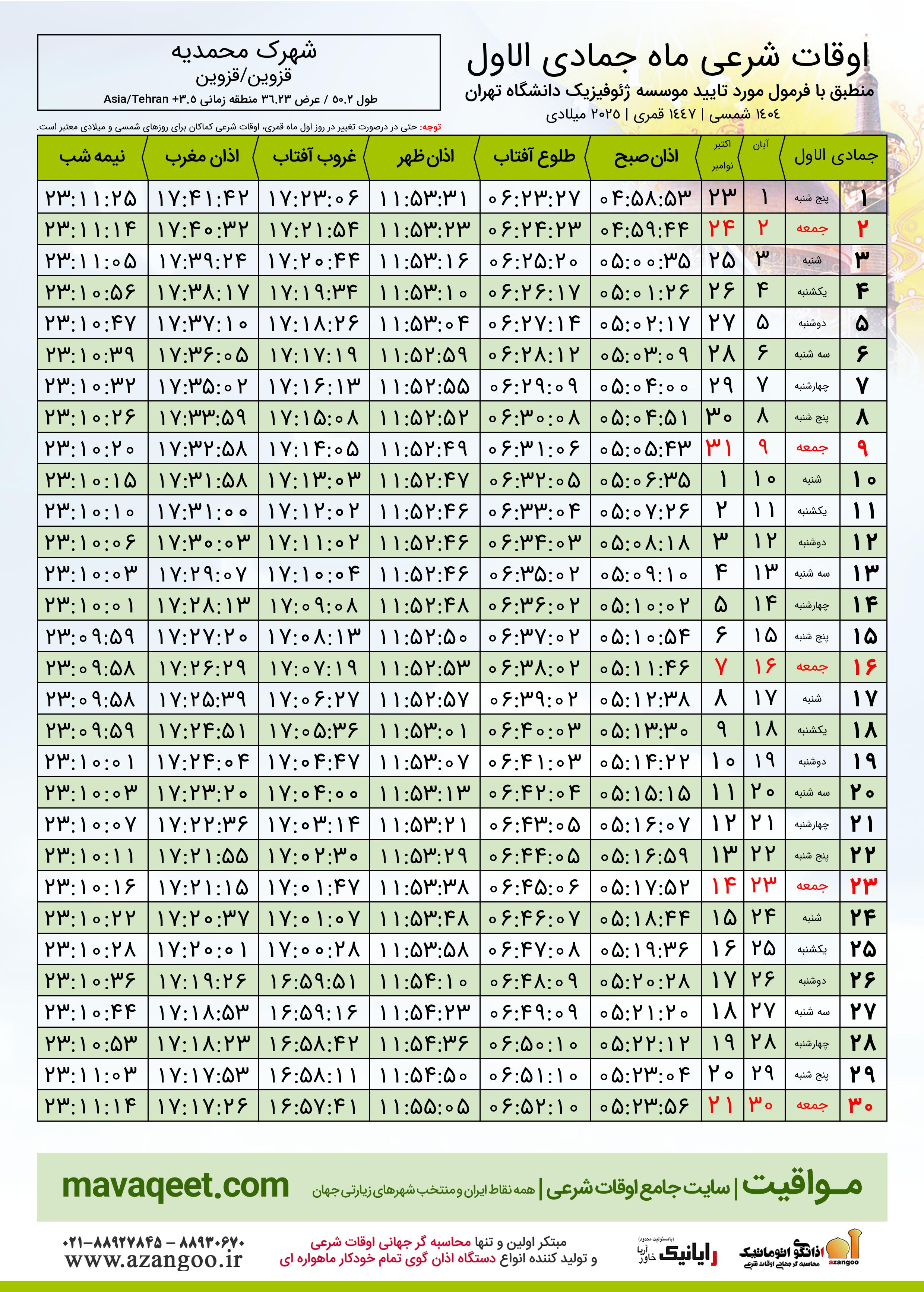 جدول اوقات شرعی جمادی الاول ١٤٤٧ قمری شهر شهرک محمدیه