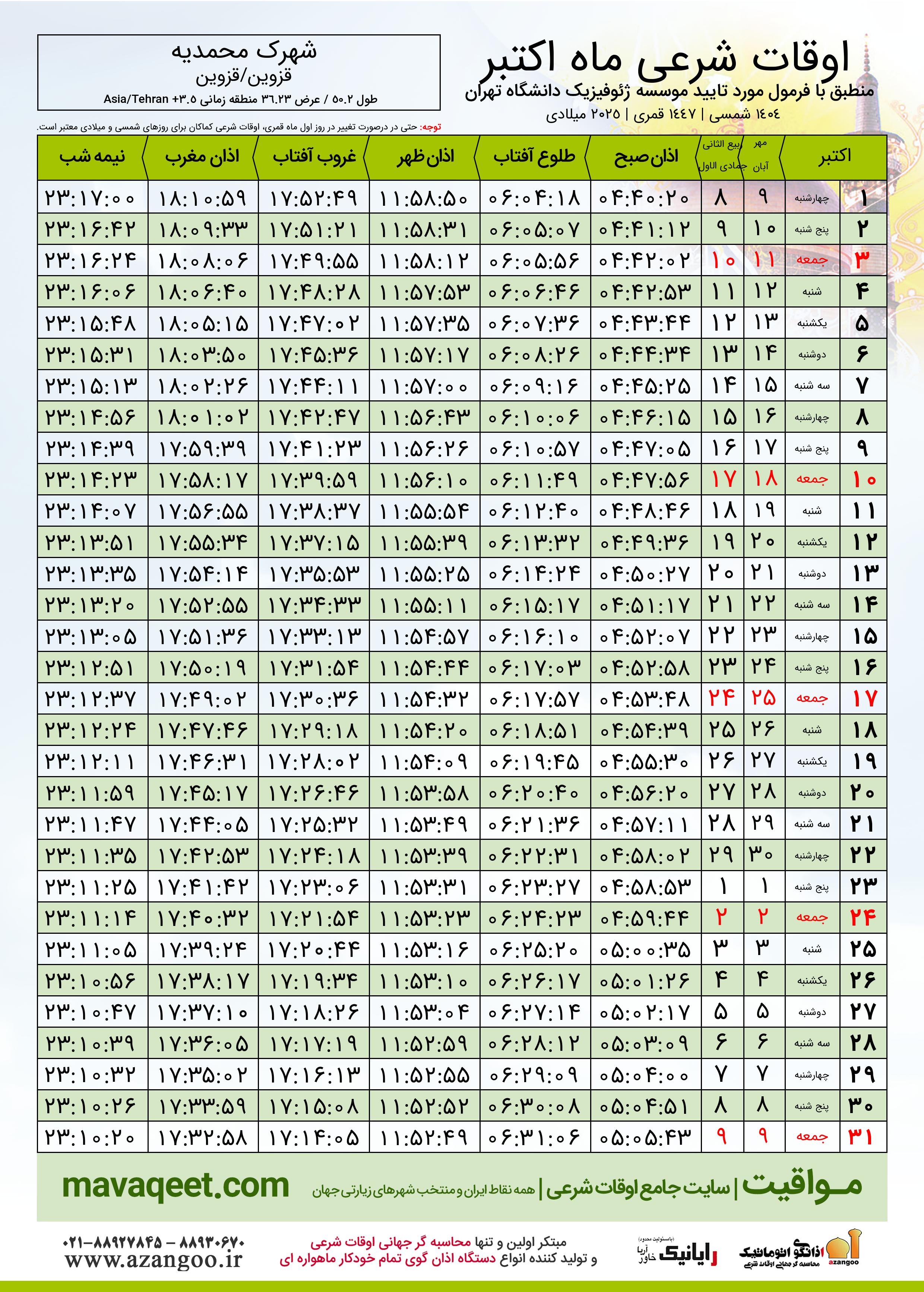 اوقات شرعی اکتبر ٢٠٢٥ میلادی شهر شهرک محمدیه