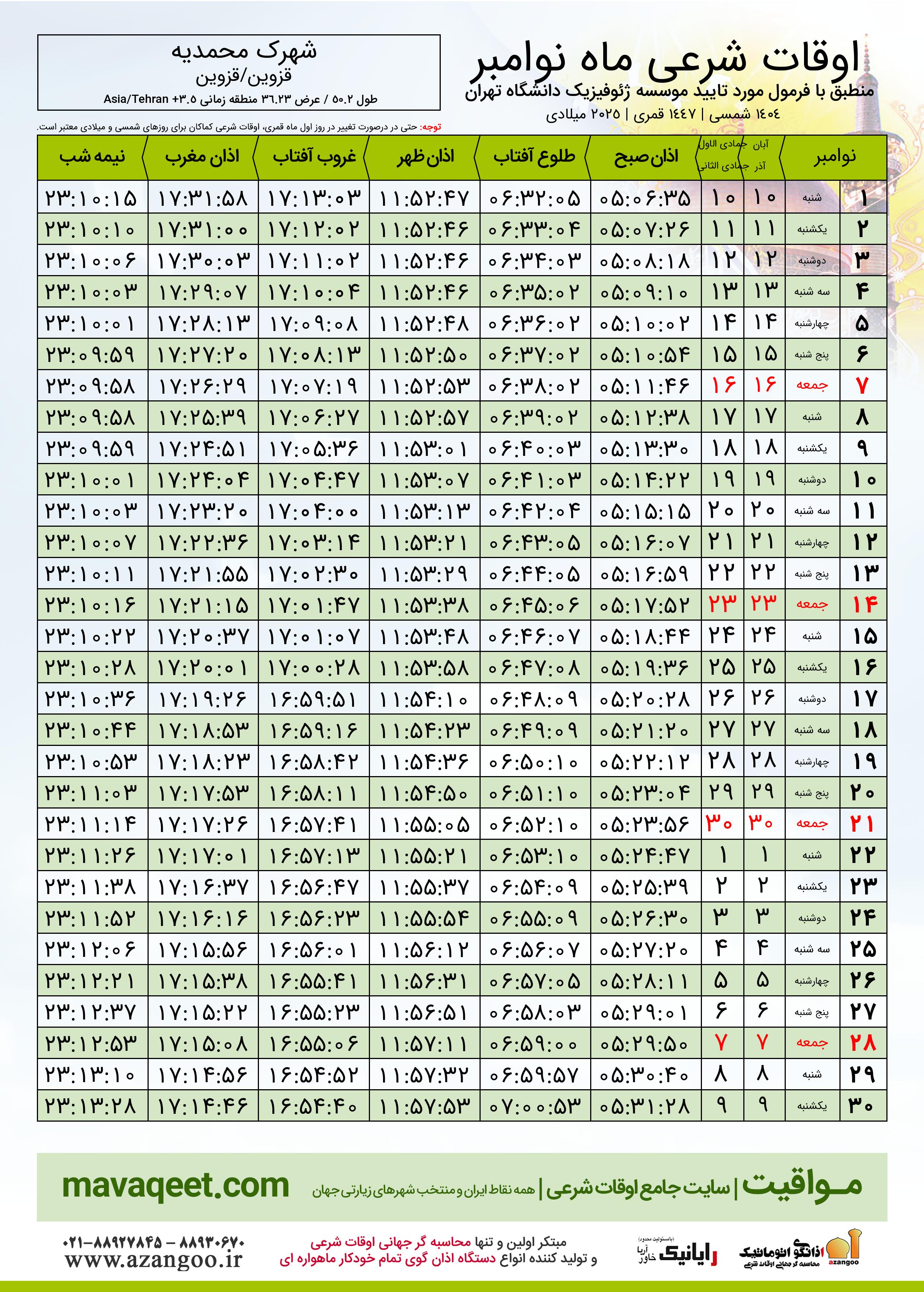 دانلود اوقات شرعی نوامبر ٢٠٢٥ شهر شهرک محمدیه