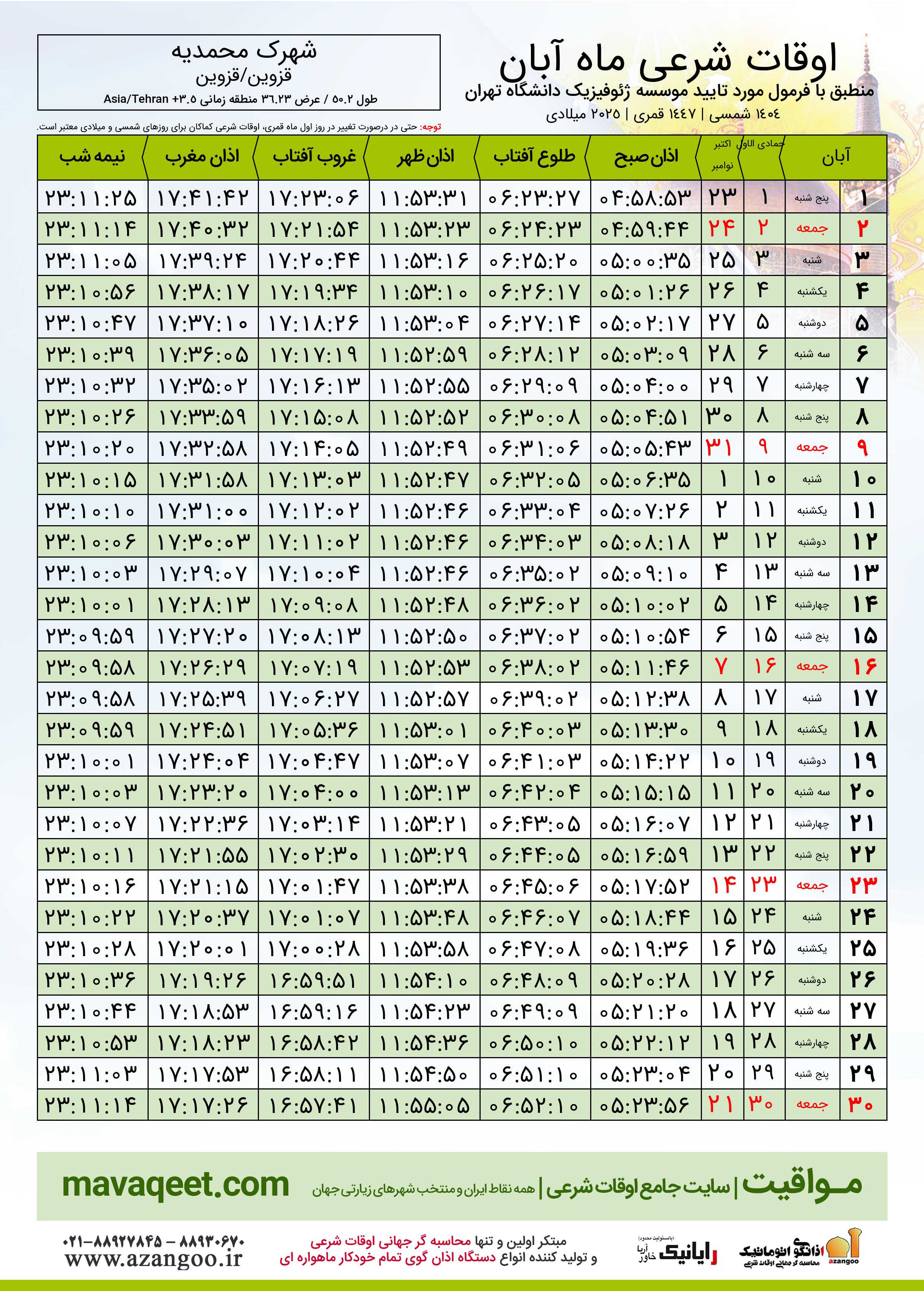 جدول اوقات شرعی آبان ١٤٠٤ شمسی شهر شهرک محمدیه
