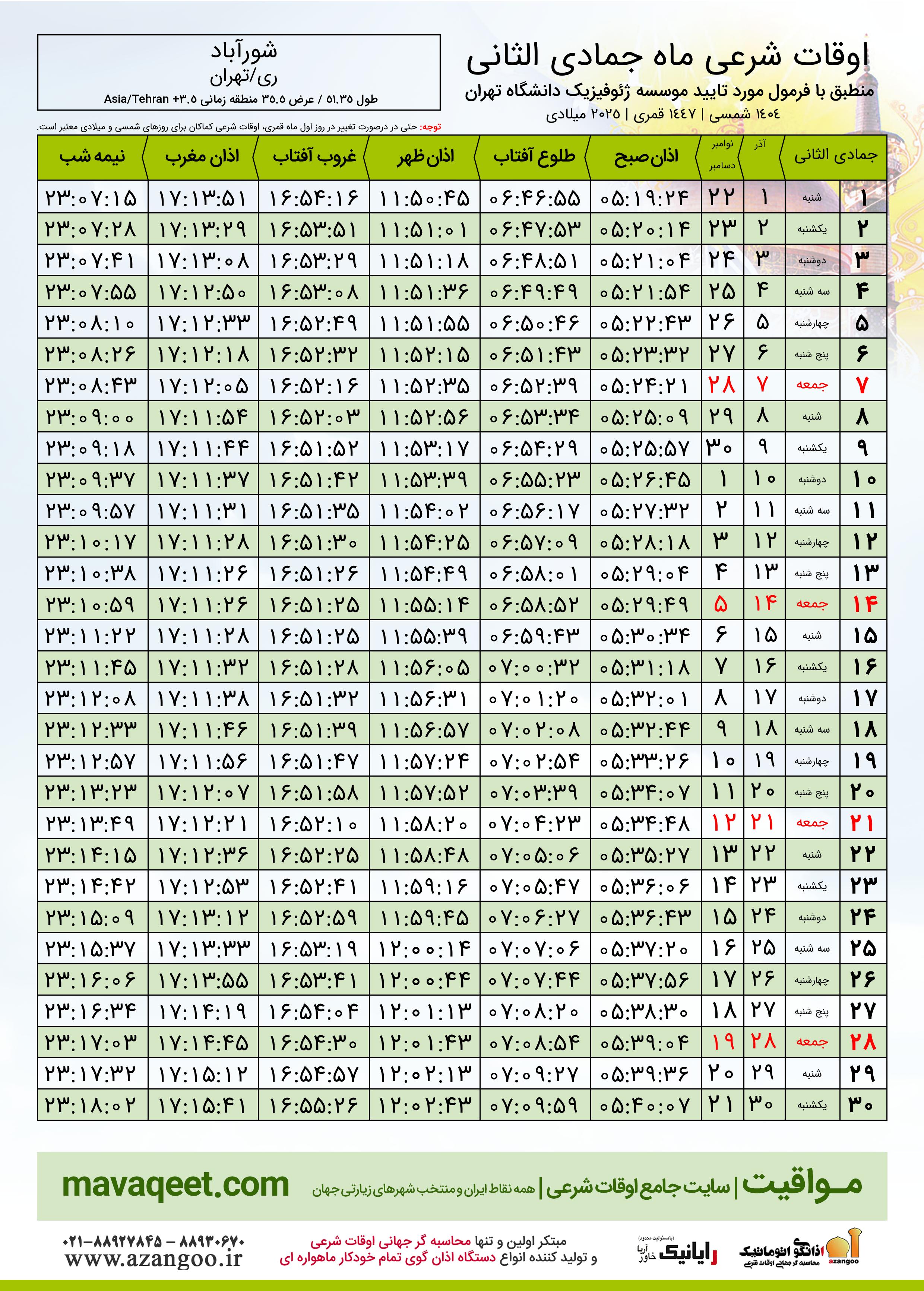 جدول اوقات شرعی جمادی الثانی ١٤٤٧ قمری شهر شورآباد