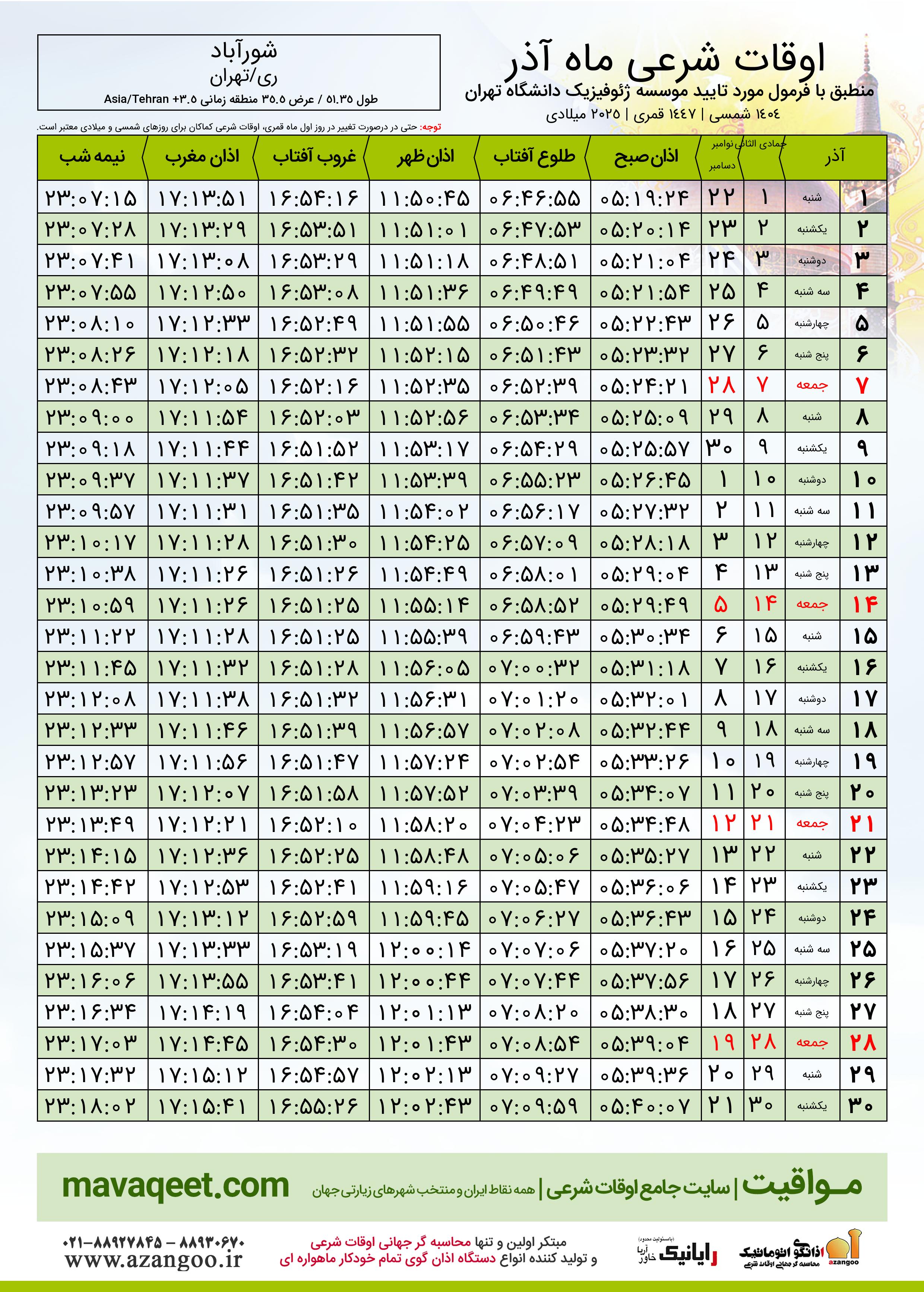 اوقات شرعی آذر ١٤٠٤ شمسی شهر شورآباد