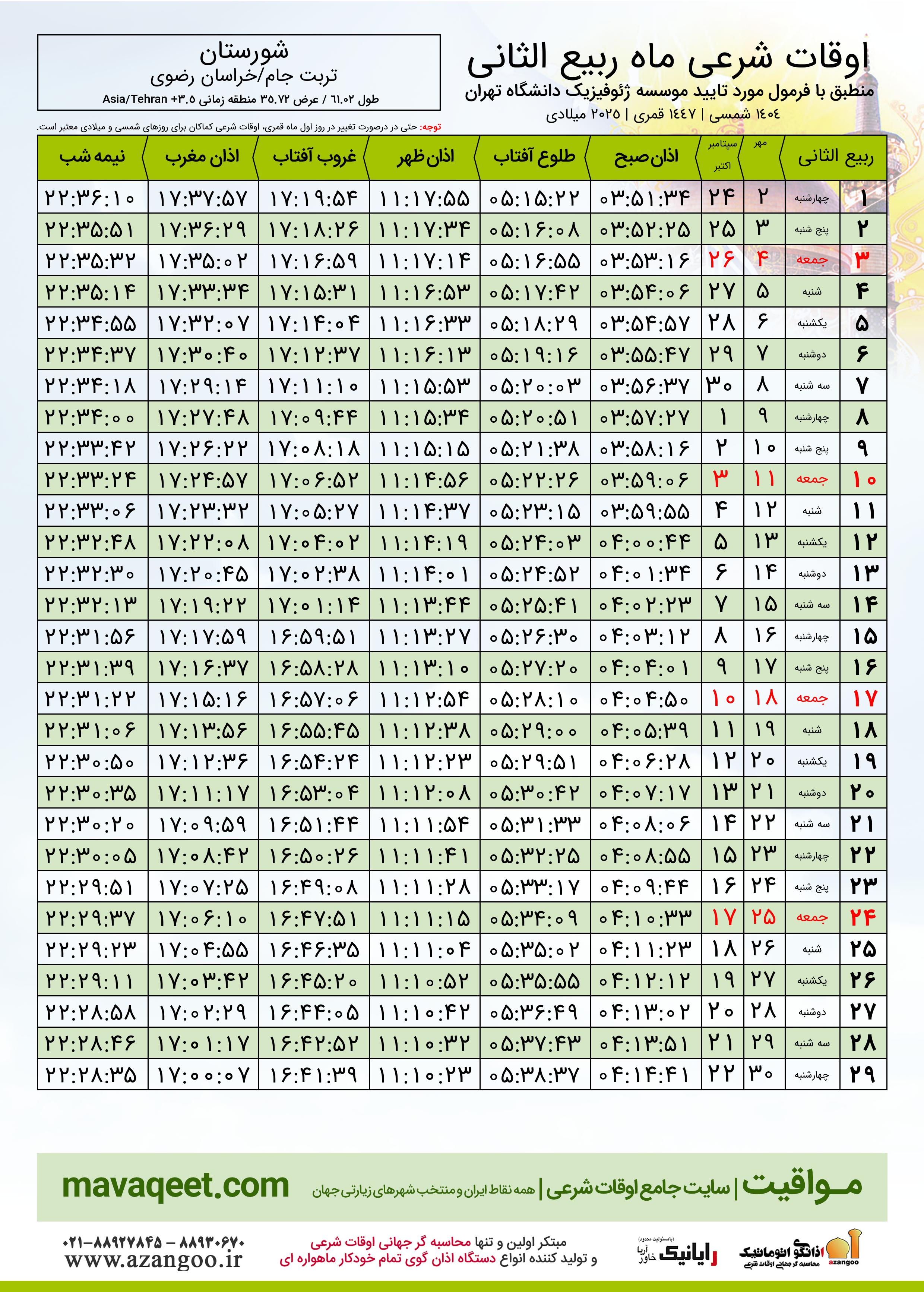 اوقات شرعی ماه ربیع الثانی ١٤٤٧ هـ.ق شهر شورستان بر