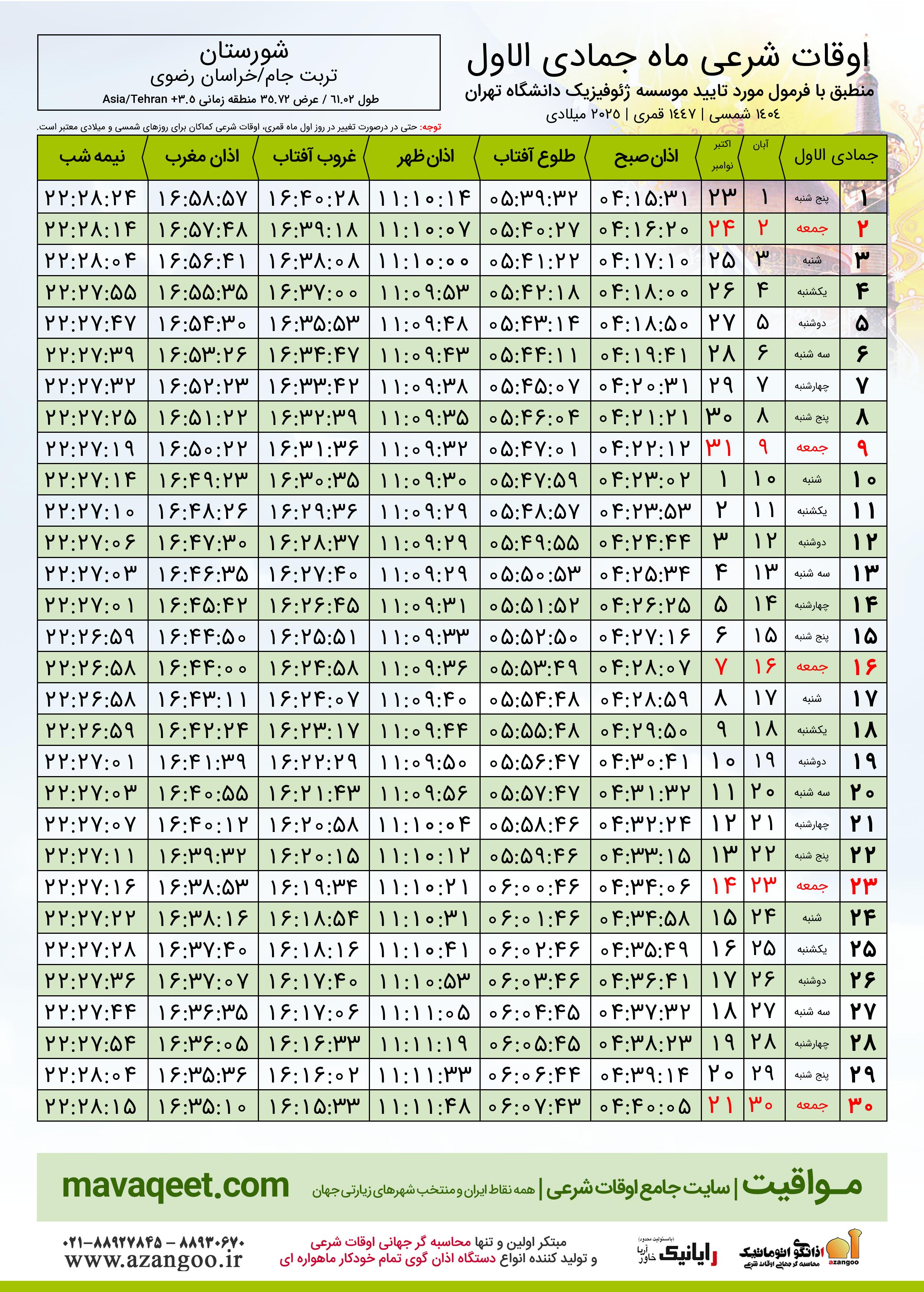 جدول اوقات شرعی جمادی الاول ١٤٤٧ قمری شهر شورستان