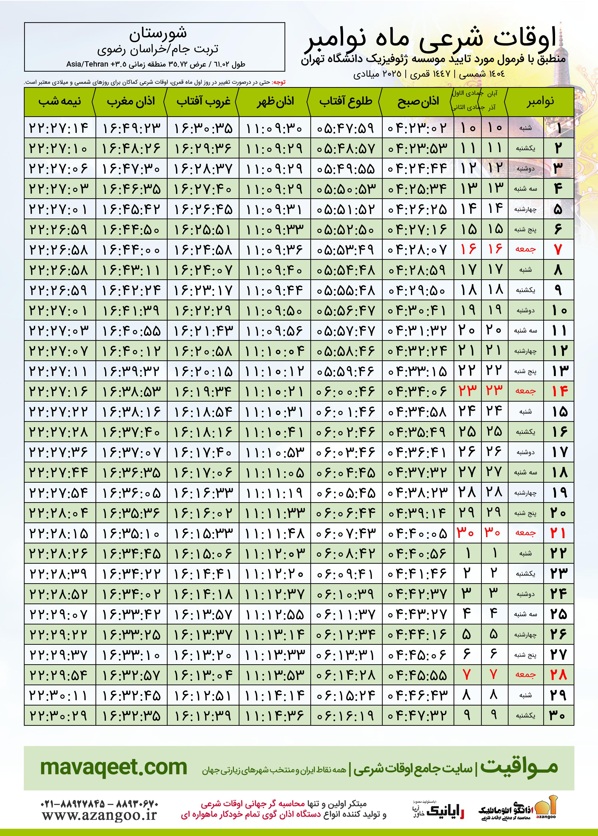 جدول اوقات شرعی نوامبر ٢٠٢٥ میلادی شهر شورستان