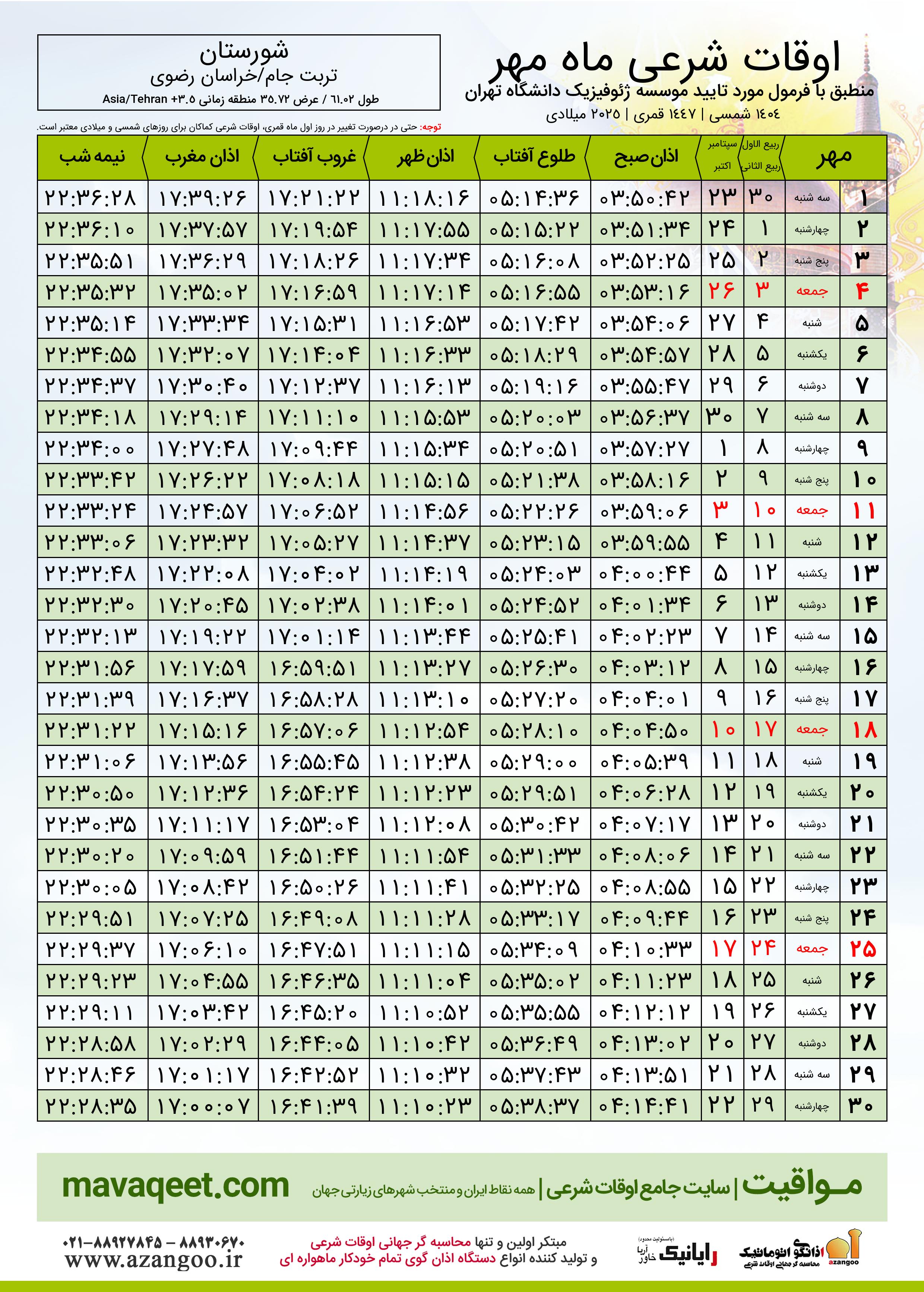 اوقات شرعی مهر ١٤٠٤ شمسی شهر شورستان