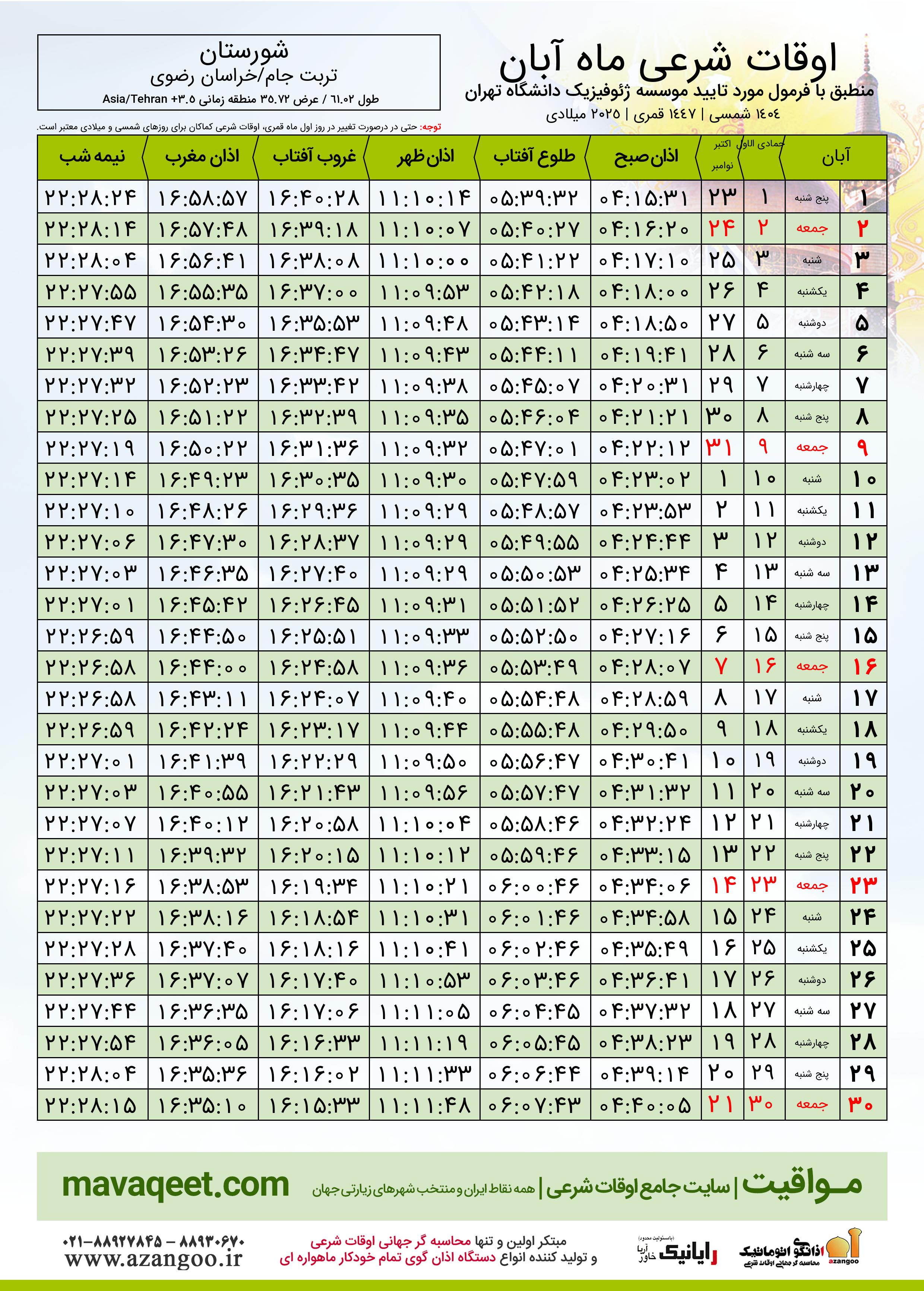 جدول اوقات شرعی آبان ١٤٠٤ شمسی شهر شورستان