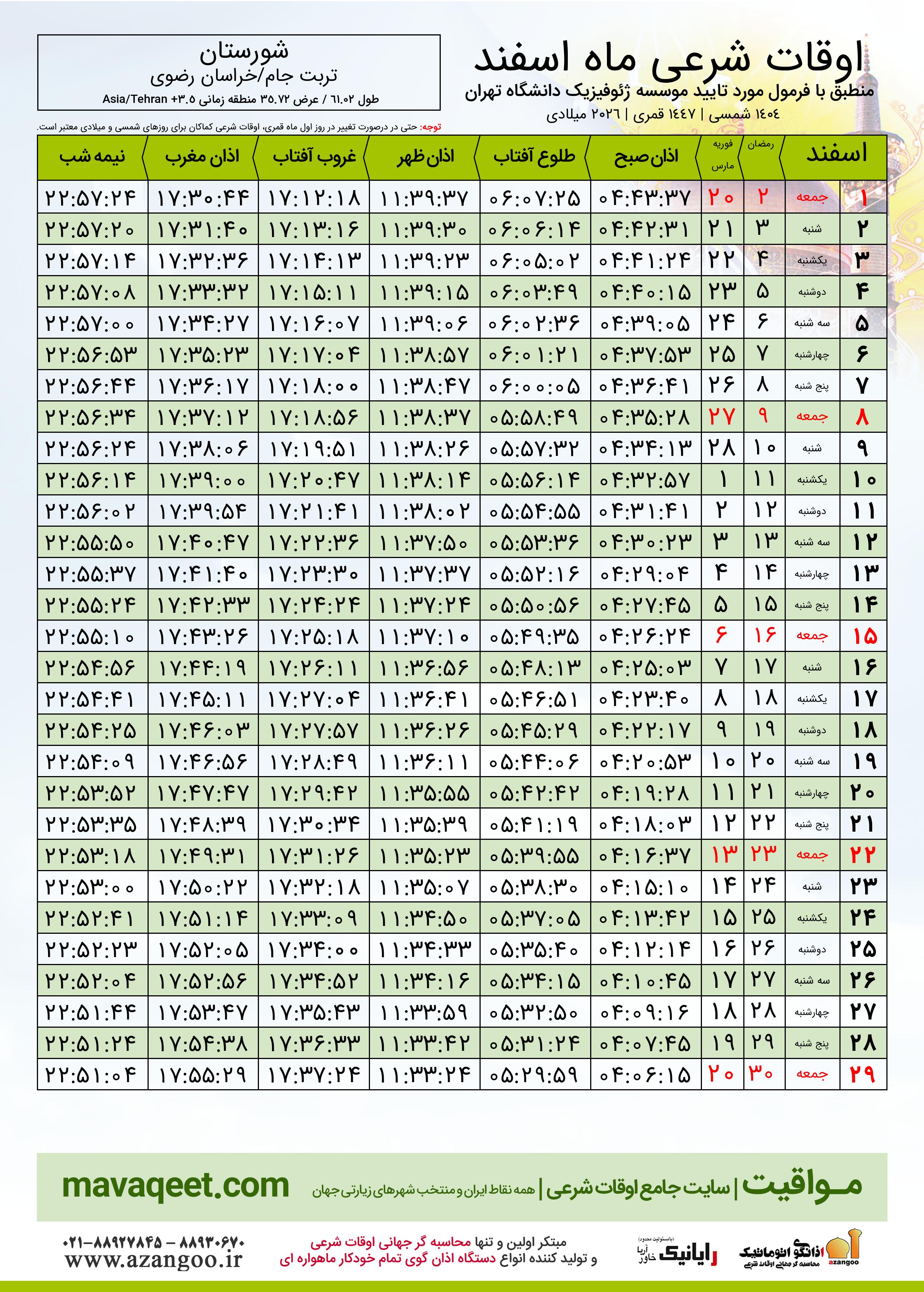جدول اوقات شرعی رمضان ١٤٤٧ قمری شهر شورستان
