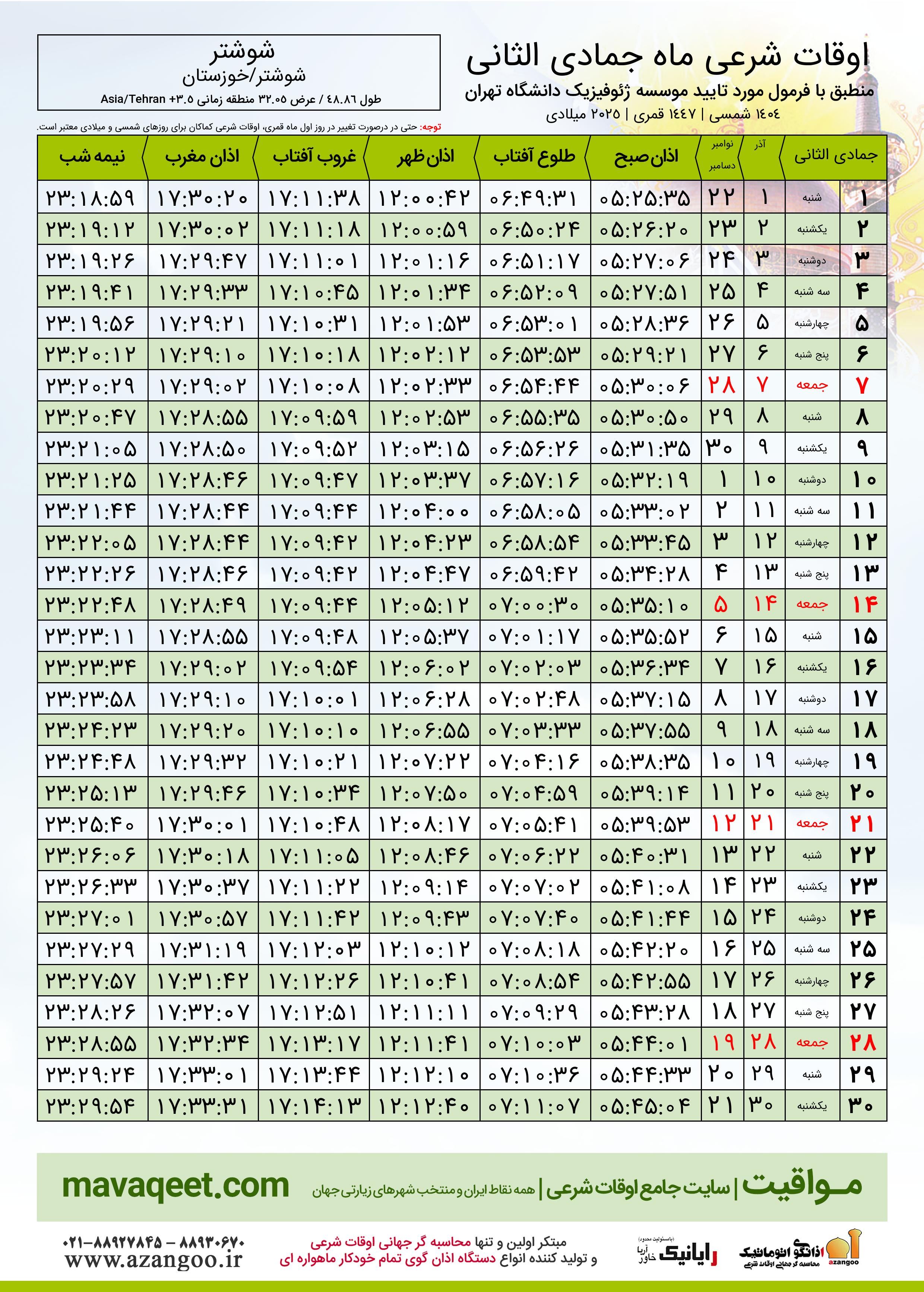 جدول اوقات شرعی جمادی الثانی ١٤٤٧ قمری شهر شوشتر